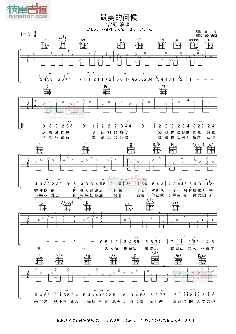 最美的问候吉他谱 - 品冠 - D调吉他弹唱谱