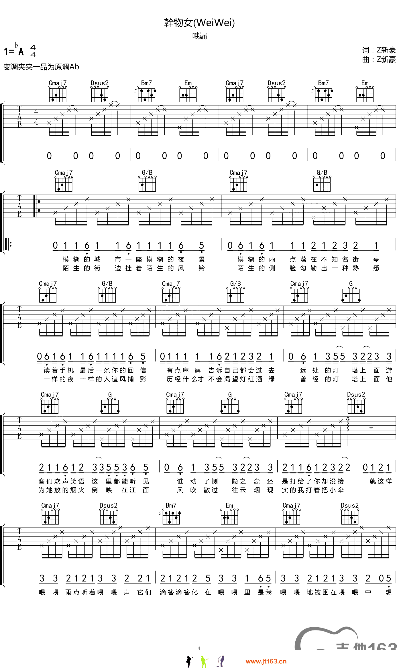 曲谱介绍: 哦漏《干物女》吉他弹唱谱,采用A调指法编配,z新豪编配出品,共有3张高清图谱。