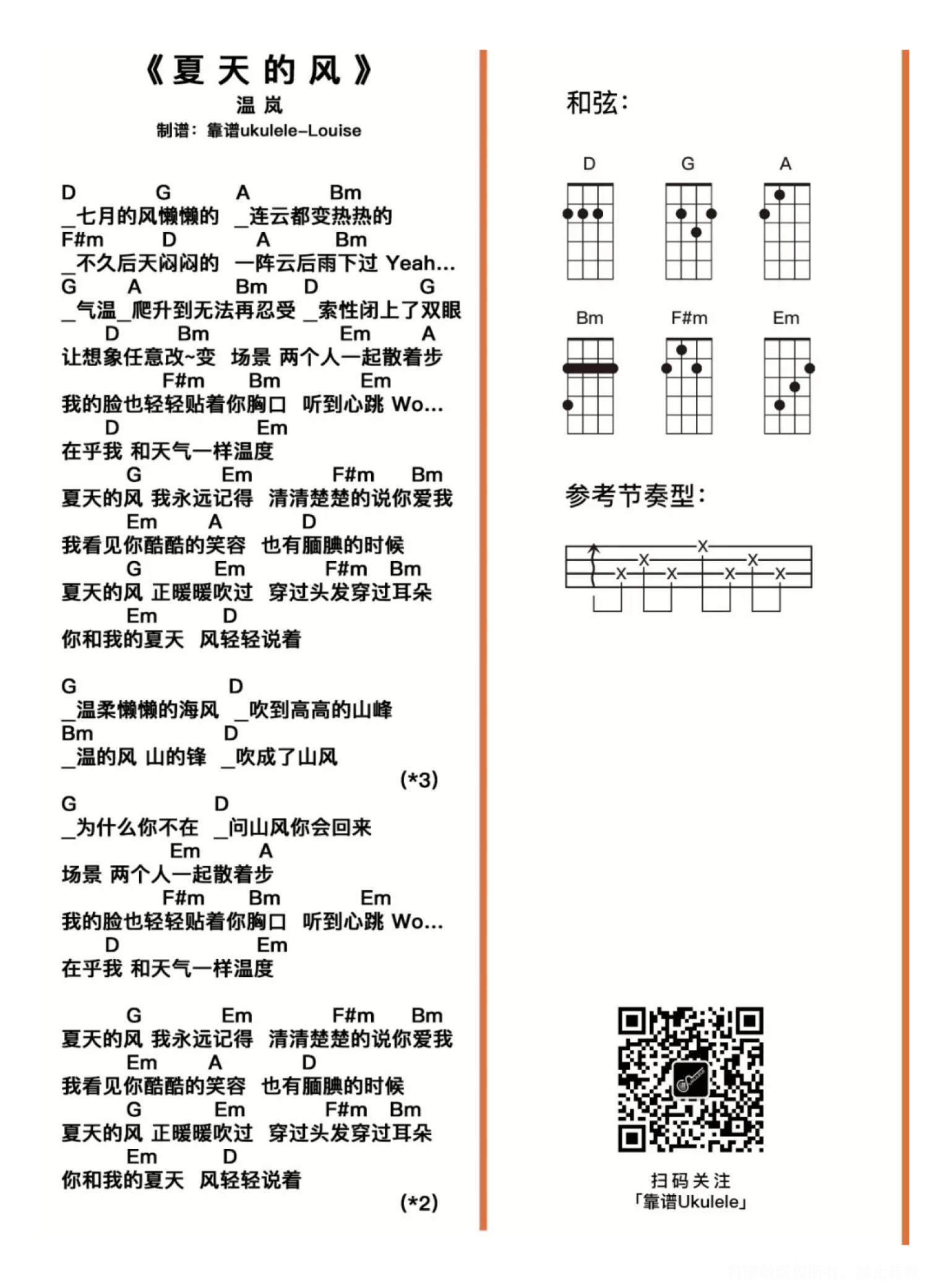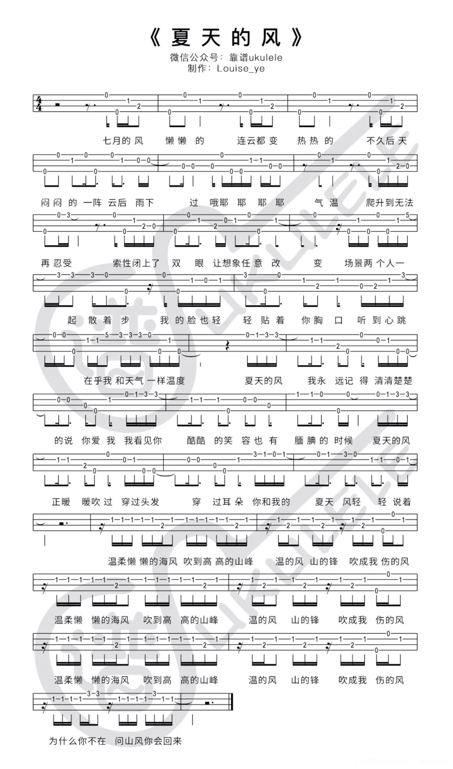 曲谱介绍: 《夏天的风》尤克里里指弹谱 单音版 其实这首歌真的很有年份,2004……你出生了吗?还记得那时候在做什么吗?听什么歌? 那年夏天是怎样的?那年夏天的风……吹着我满满回忆……那一年比起现在想的简单,笑得欢乐……不想长大的那一年…… 难度系数:★ 是蛮喜欢这首歌的,喜欢的原因……不详,不记得当时喜欢的时候是一种怎样的心情……歌算好唱的,对应歌词相信节奏旋律也都不难控制。 由于制作谱的这个长度有些尴尬,这次就还是给一张整图,不分页了,建议保存之后查看效果可能会比较好吧?   《夏天的风》尤克里里弹唱谱 最近总是下雨……今年的雨季感觉一直都迟迟不走……就这两天稍微放晴了一些些,然后……(ಥ_ಥ) 查了未来几天的天气预报,厦门至少还有一周要下雨〒▽〒…… 有没有人跟我一样,迫切的想要感受「夏天的风」…… 去吹吹海风*:ஐ٩(๑´ᵕ`)۶ஐ:* 之类的……   难度系数:★☆ 如果你基础不好,建议单独把和弦按准确了再弹唱哦~(实在是没有办法看懂的朋友可以参考一下「和弦的多种指法,不完整分享」里面有分享建议的指法,希望对你们有帮助~)。 节奏型基本大部分是一个和弦对应一组节奏型,个别地方需要多弹一次,自己尝试吧,俗话说的好,……修行在个人,如果你也是自学的宝宝,那就不要过分依赖……多花点心思才有成就感。