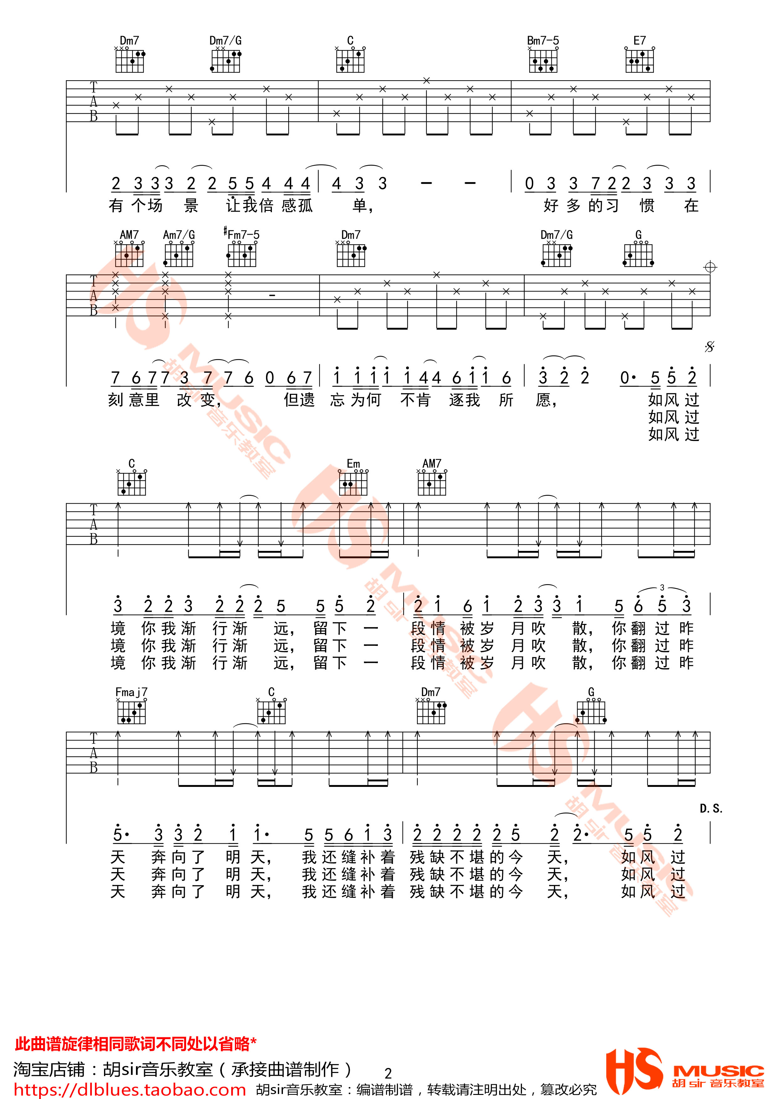 曲谱介绍: 哎哟蔚蔚《如风过境》吉他弹唱谱,采用C调指法编配,胡sir音乐教室编配出品,共有3张高清图谱。