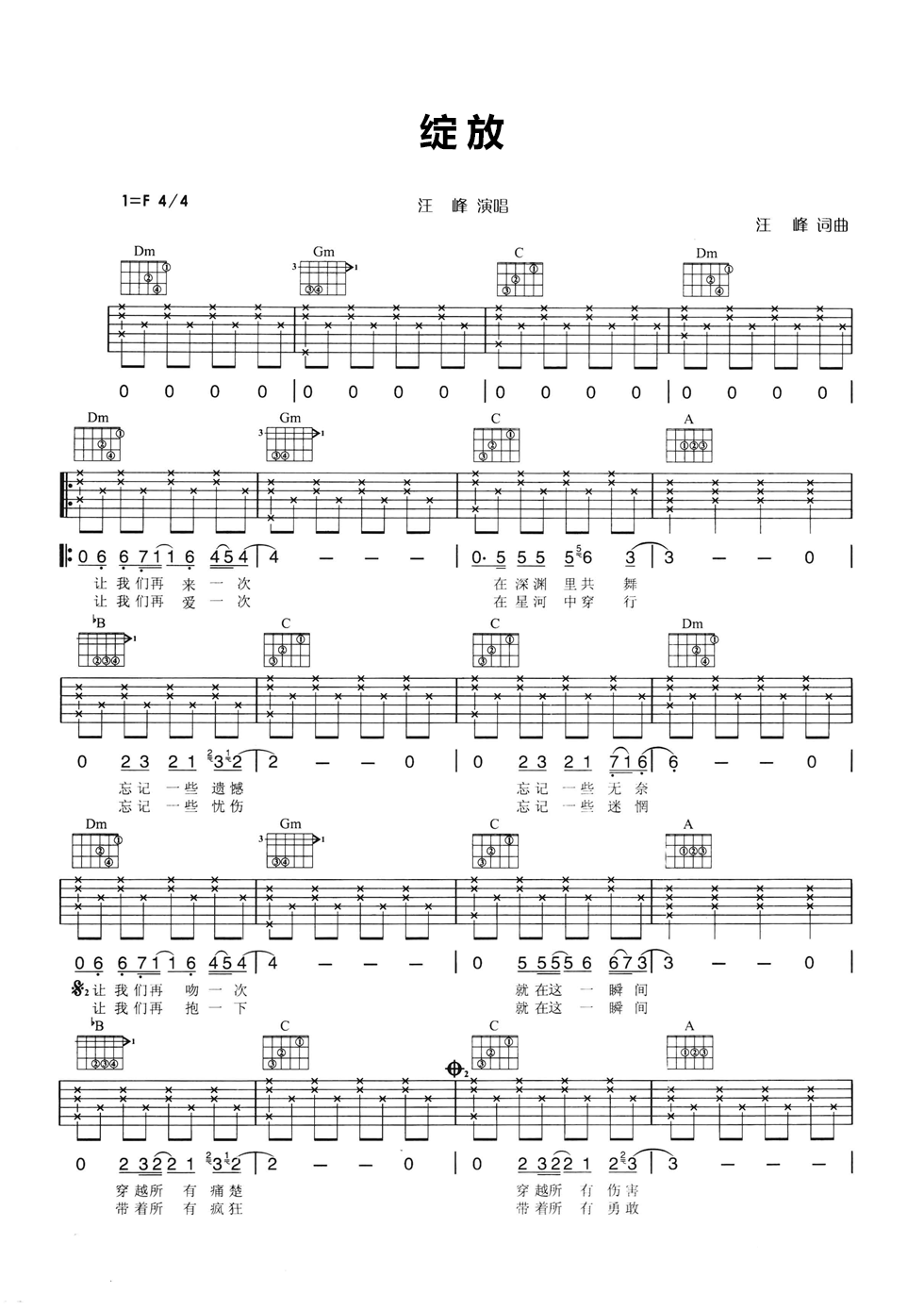 曲谱介绍: 汪峰《绽放》吉他弹唱谱,采用F调指法编配,共有2张高清图谱,免翻页排版设计。