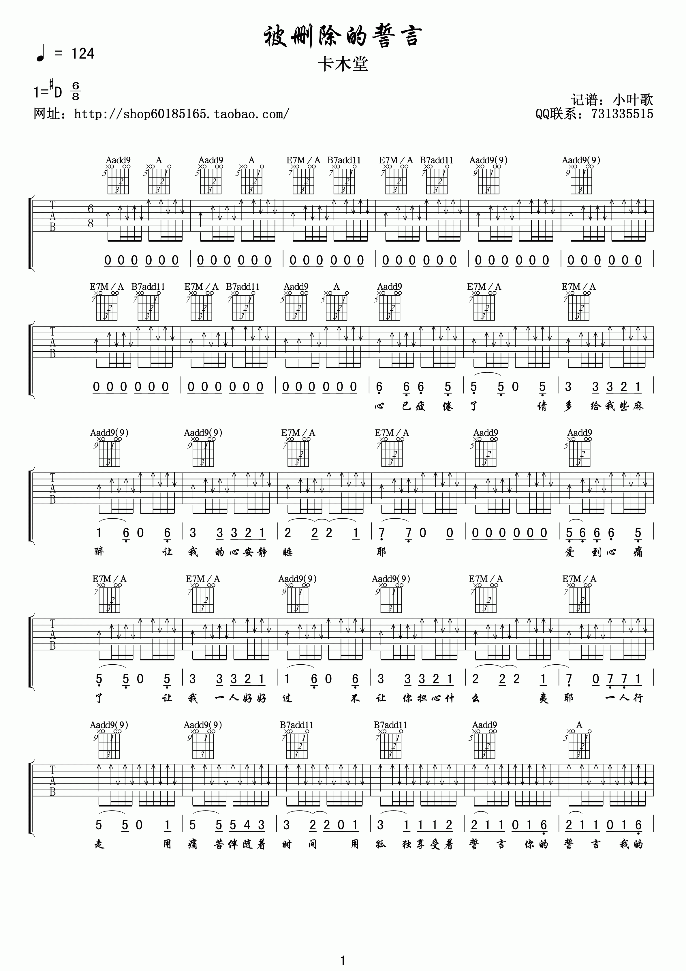 曲谱介绍: 卡木堂《被删除的誓言》吉他弹唱谱,采用D调指法编配,小叶歌吉他编配出品,共有3张高清图谱。