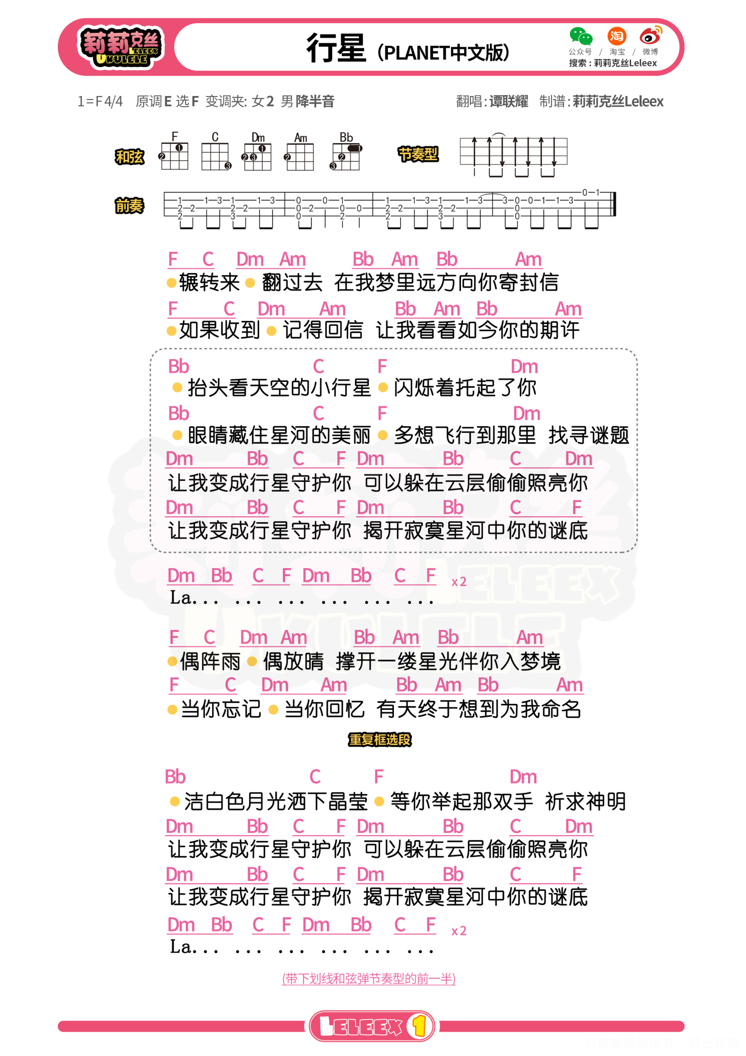 曲谱介绍: 「行星Planet」尤克里里曲谱 更多尤克里里曲谱/教学  关注@莉莉克丝Leleex