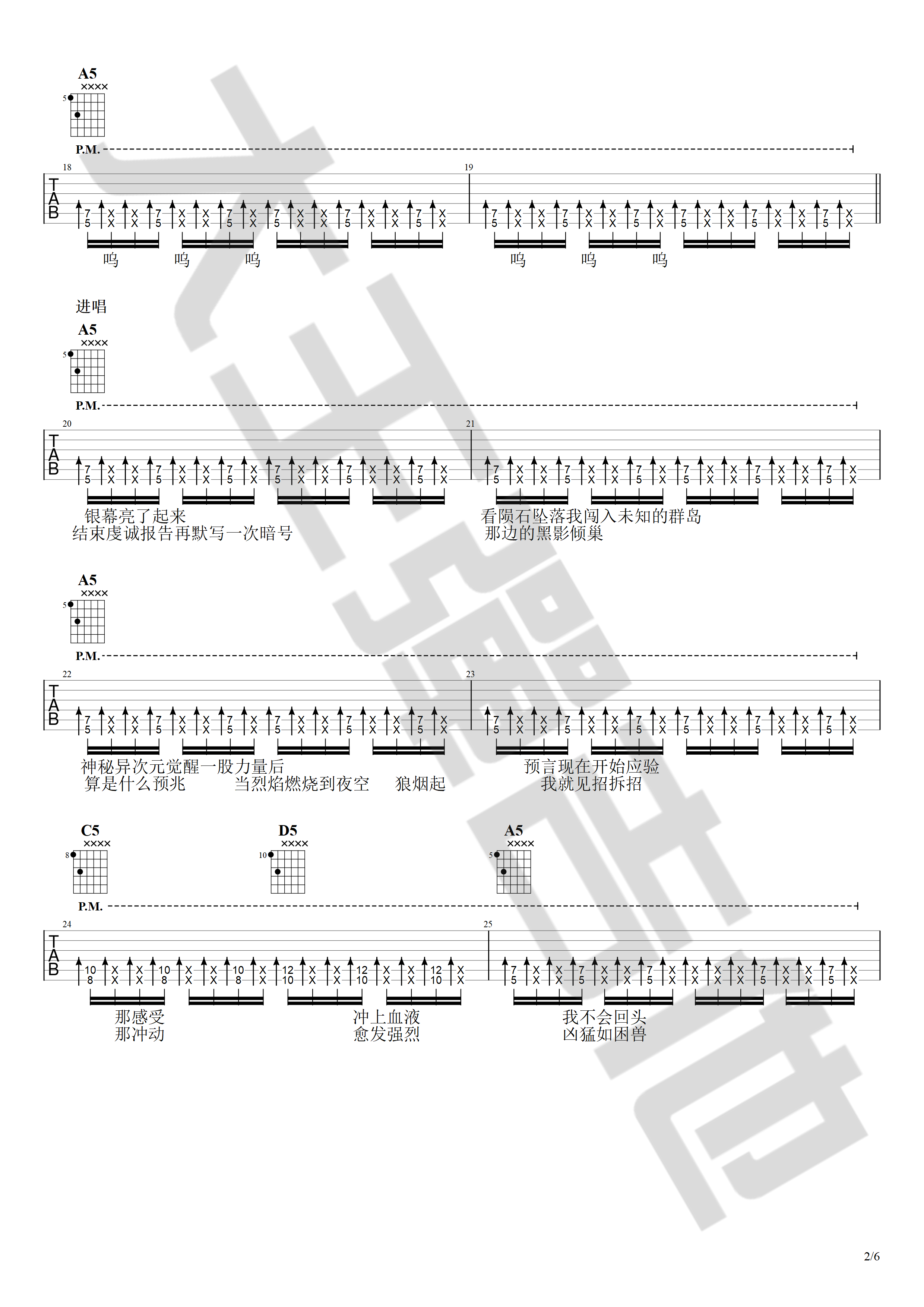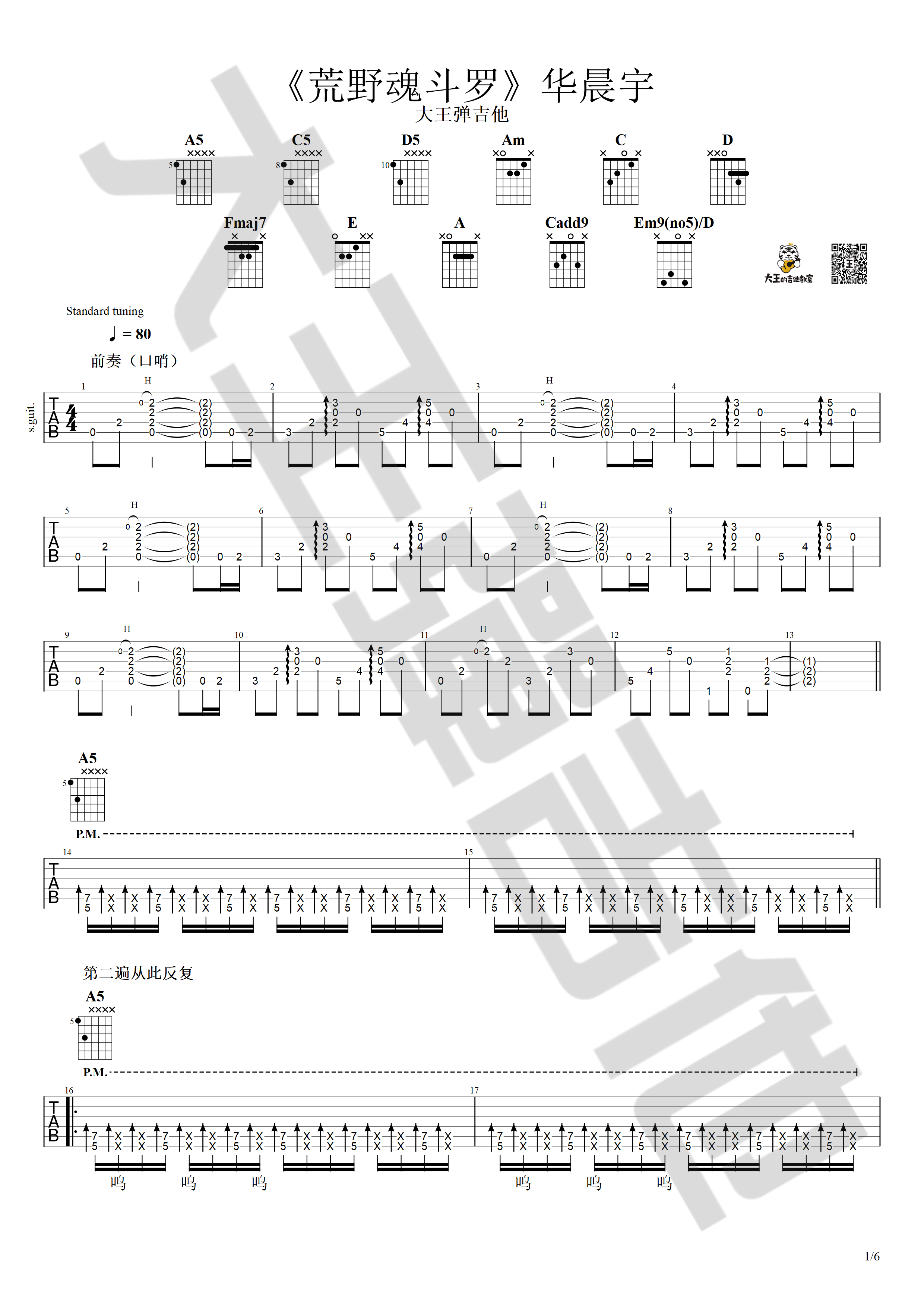 曲谱介绍: 华晨宇《荒野魂斗罗》吉他弹唱谱,采用C调指法编配,大王弹吉他编配出品,共有6张高清图谱。