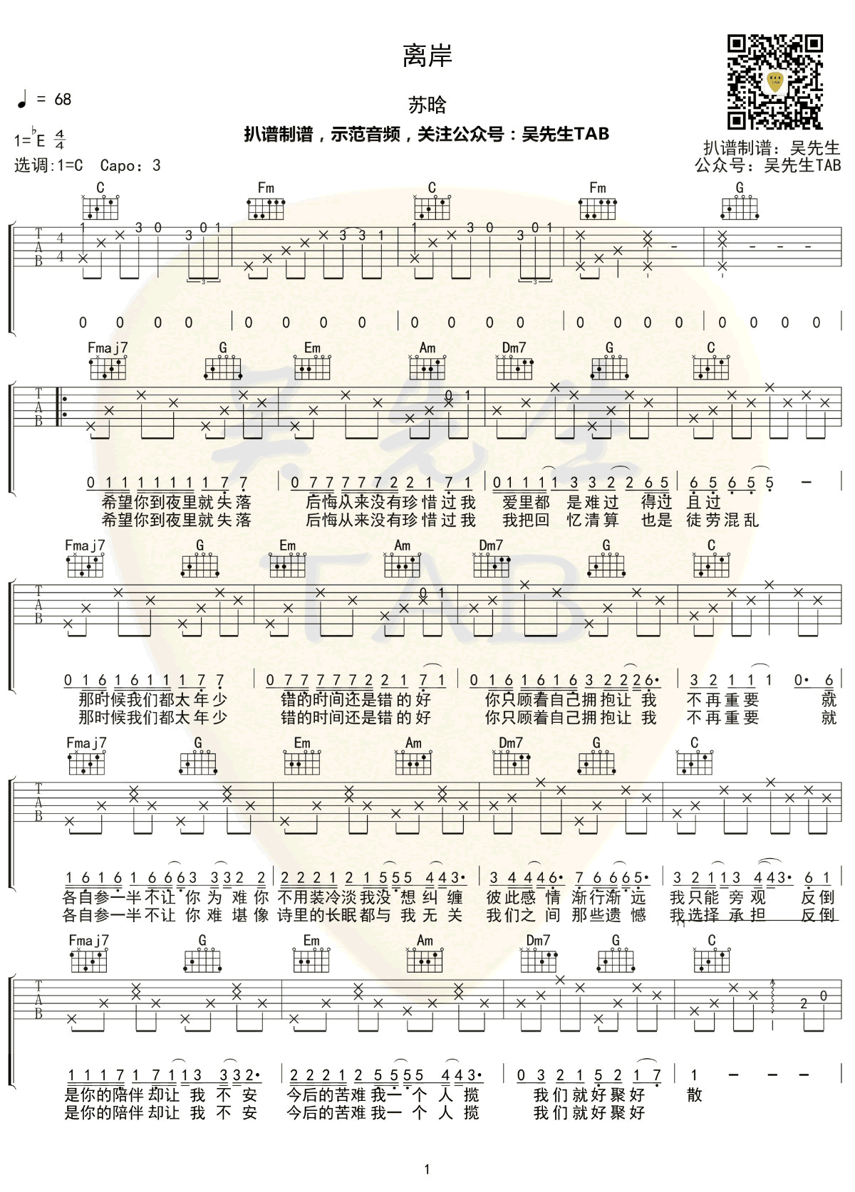 曲谱介绍: 苏晗《离岸》吉他弹唱谱,采用C调指法编配,吴先生编配出品,共有2张高清图谱,免翻页排版设计。