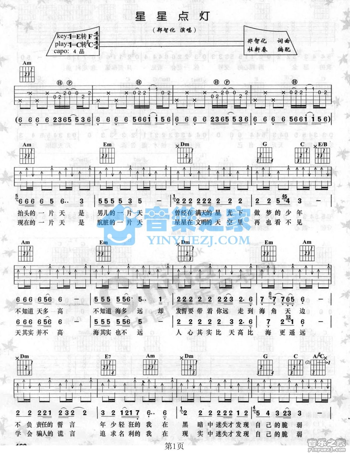曲谱介绍: 郑智化《星星点灯》吉他弹唱谱,采用C调指法编配,音乐之家编配出品,共有3张高清图谱。