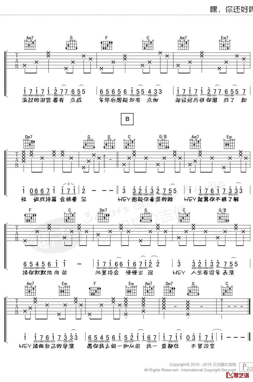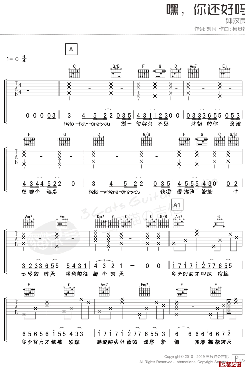 曲谱介绍: 钟汉良《嘿你还好吗》吉他弹唱谱,采用C调指法编配,琴艺谱编配出品,共有2张高清图谱,免翻页排版设计。