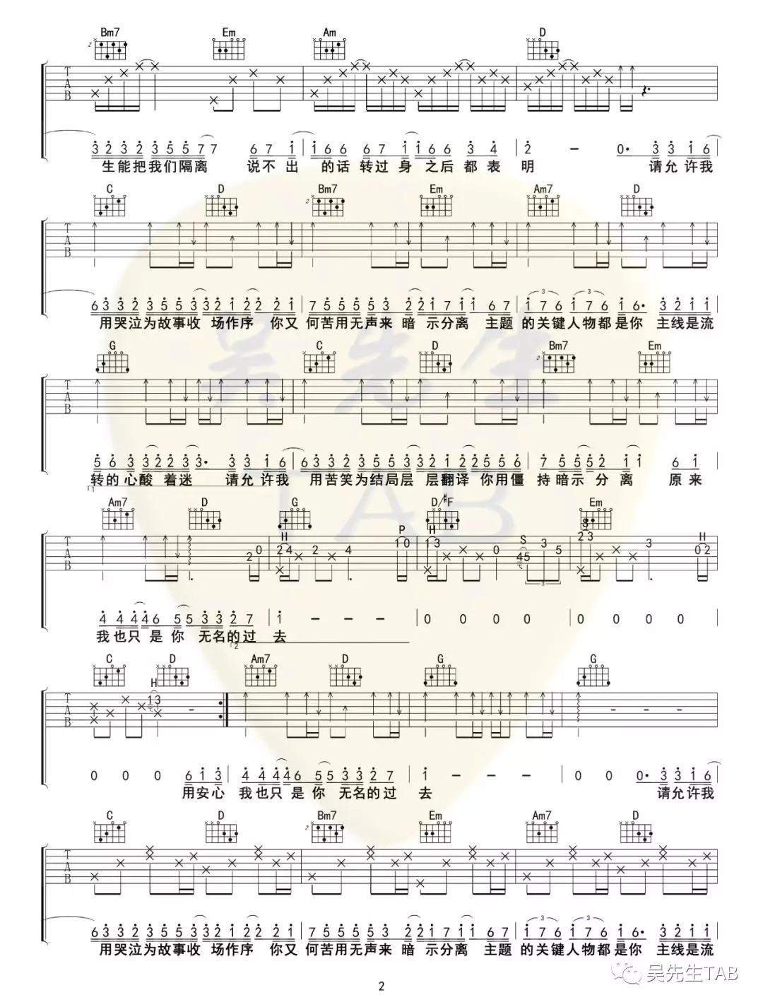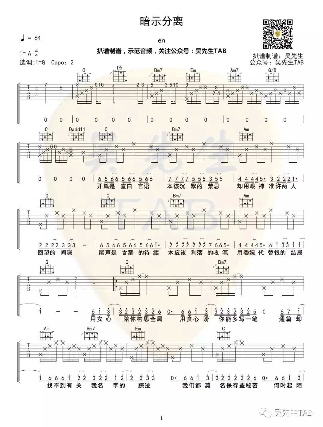 曲谱介绍: en《暗示分离》吉他弹唱谱,采用A调指法编配,吴先生编配出品,共有3张高清图谱。