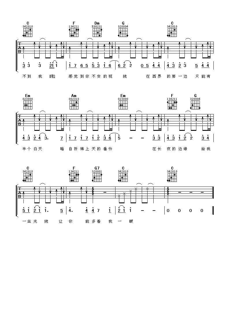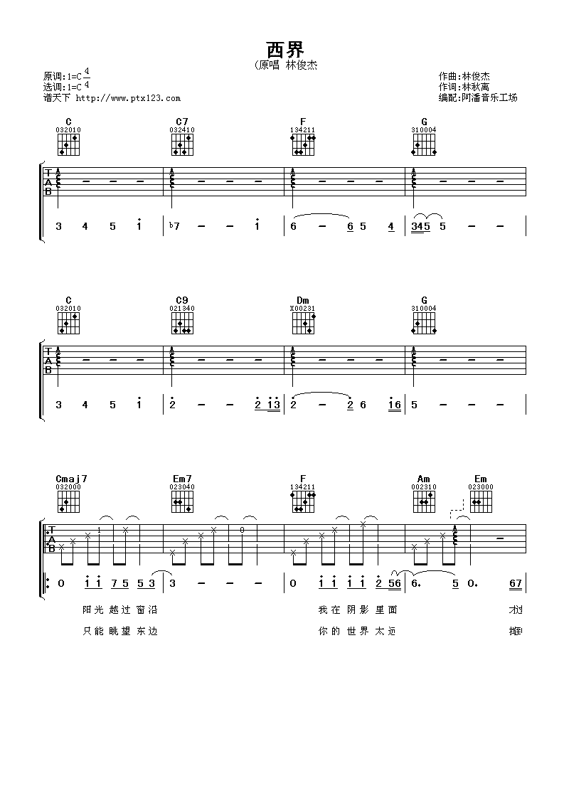 曲谱介绍: 林俊杰《西界》吉他弹唱谱,采用C调指法编配,阿潘音乐工场编配出品,共有3张高清图谱。