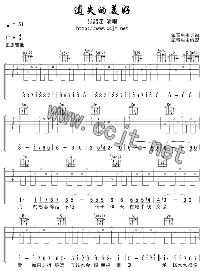 曲谱介绍: 张韶涵《遗失的美好》吉他弹唱谱,采用F调指法编配,笨蛋虫虫编配出品,共有3张高清图谱。