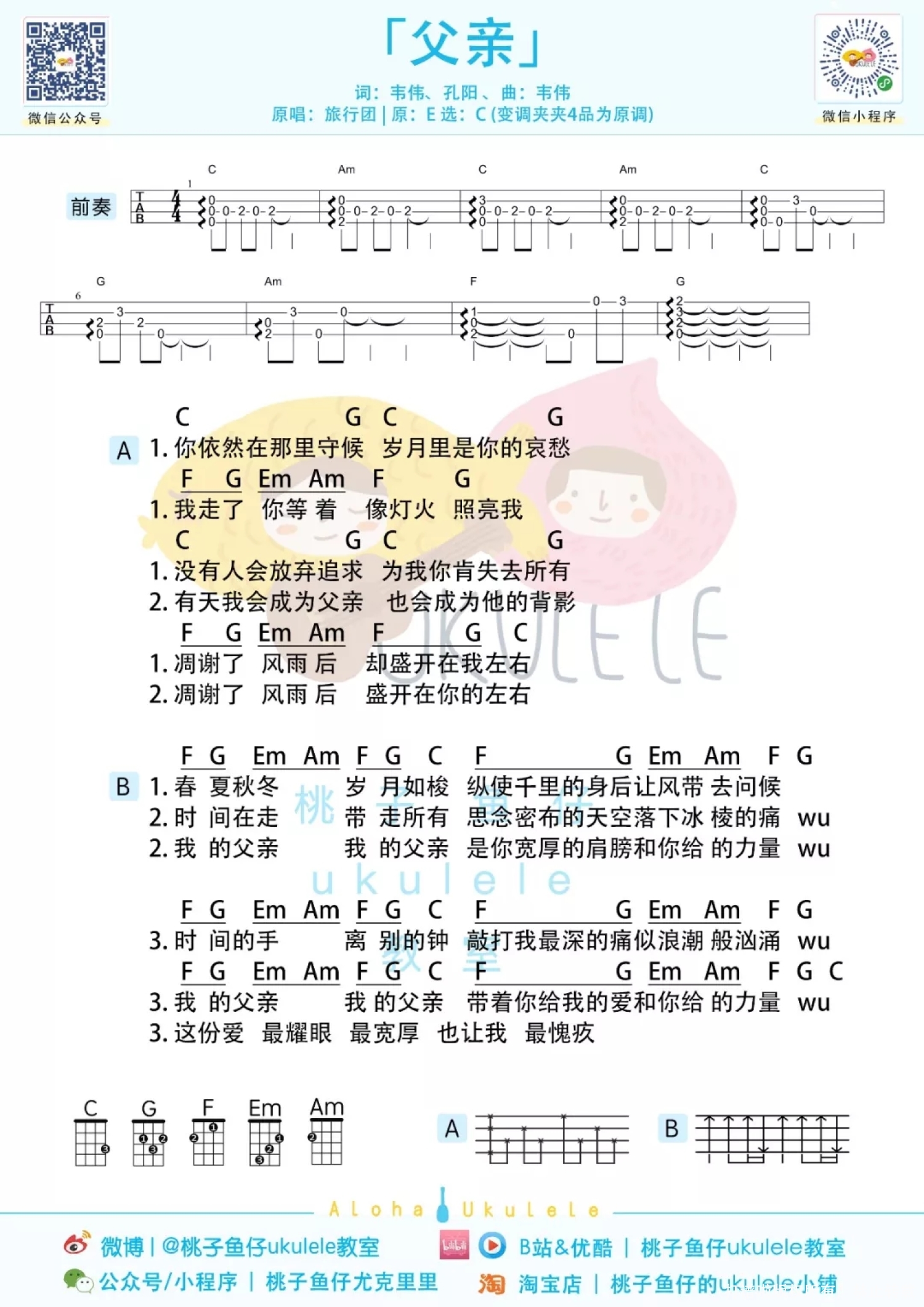 曲谱介绍: 父亲们都很酷 不喜欢把爱挂在嘴边 但时间,隐藏不了他的爱 父亲节将至 唱一首表达爱的歌曲 祝福伟大的父亲节日快乐   《父亲》尤克里里谱