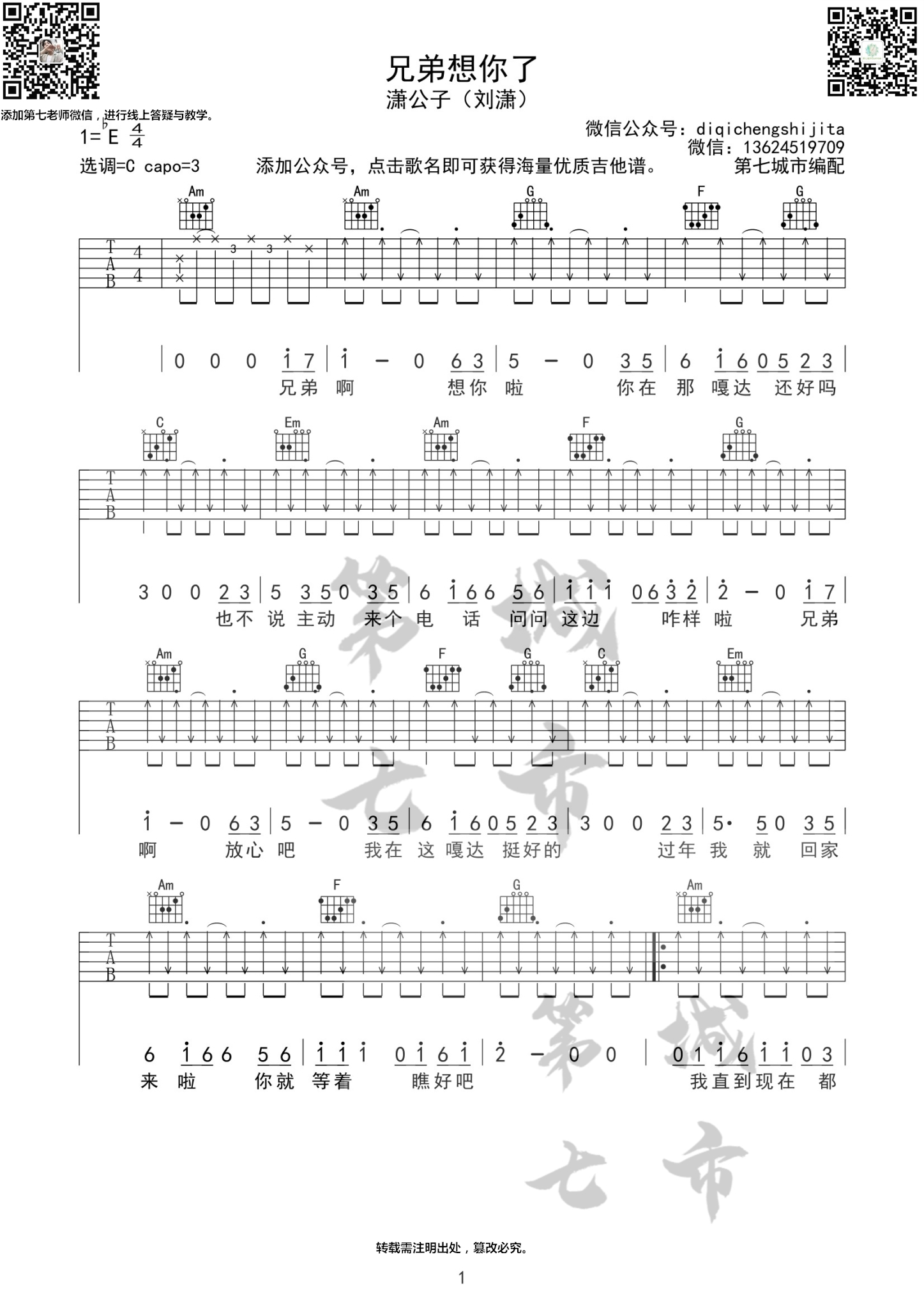 曲谱介绍: 《兄弟想你了》吉他弹唱谱,采用C调指法编配,共有3张高清图谱。