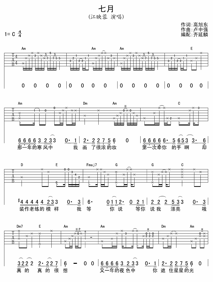曲谱介绍: 江映蓉《七月》吉他弹唱谱,采用C调指法编配,齐延麟编配出品,共有2张高清图谱,免翻页排版设计。