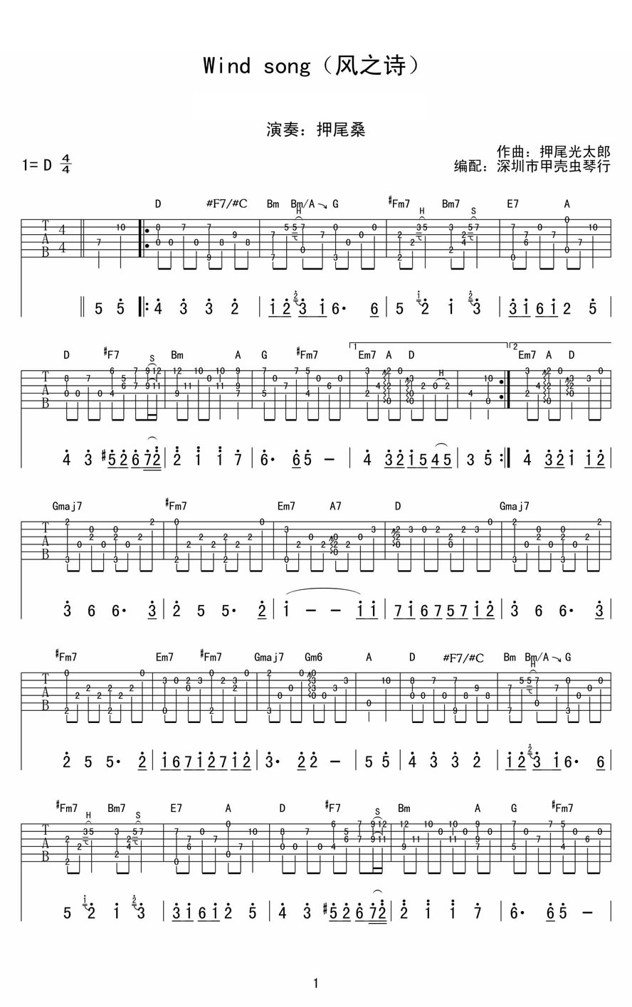 曲谱介绍: 押尾桑《风之诗》吉他独奏谱,采用D调指法编配,甲壳虫琴行编配出品,共有2张高清图谱,免翻页排版设计。