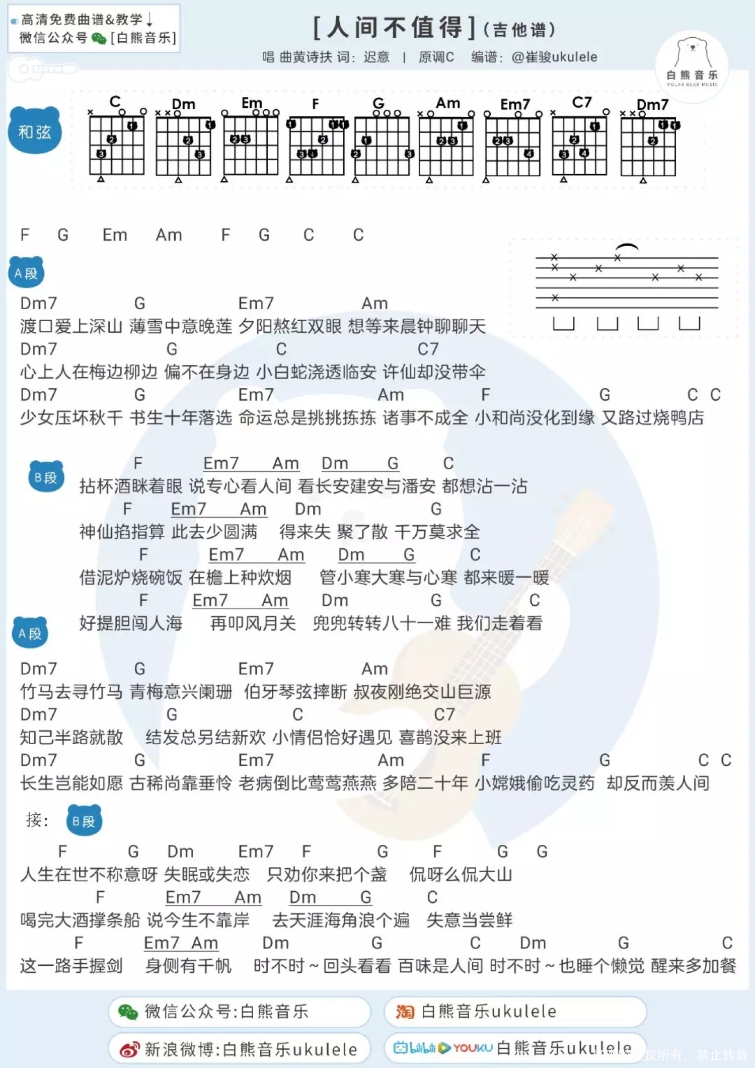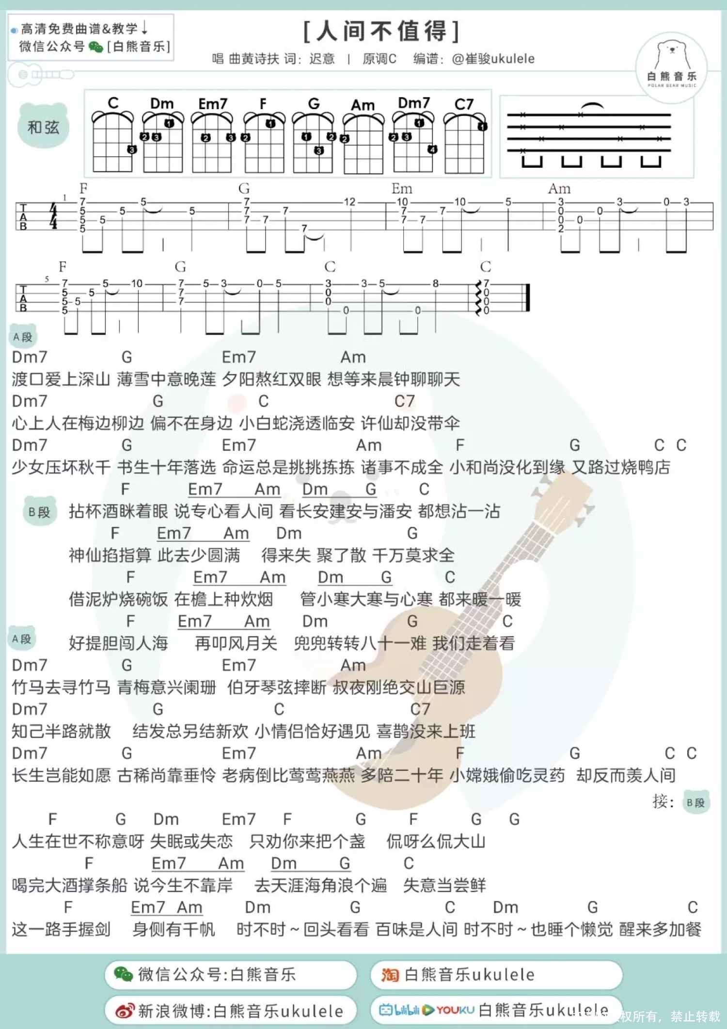 曲谱介绍: 人间不值得尤克里里谱 白熊版 人间不值得吉他谱