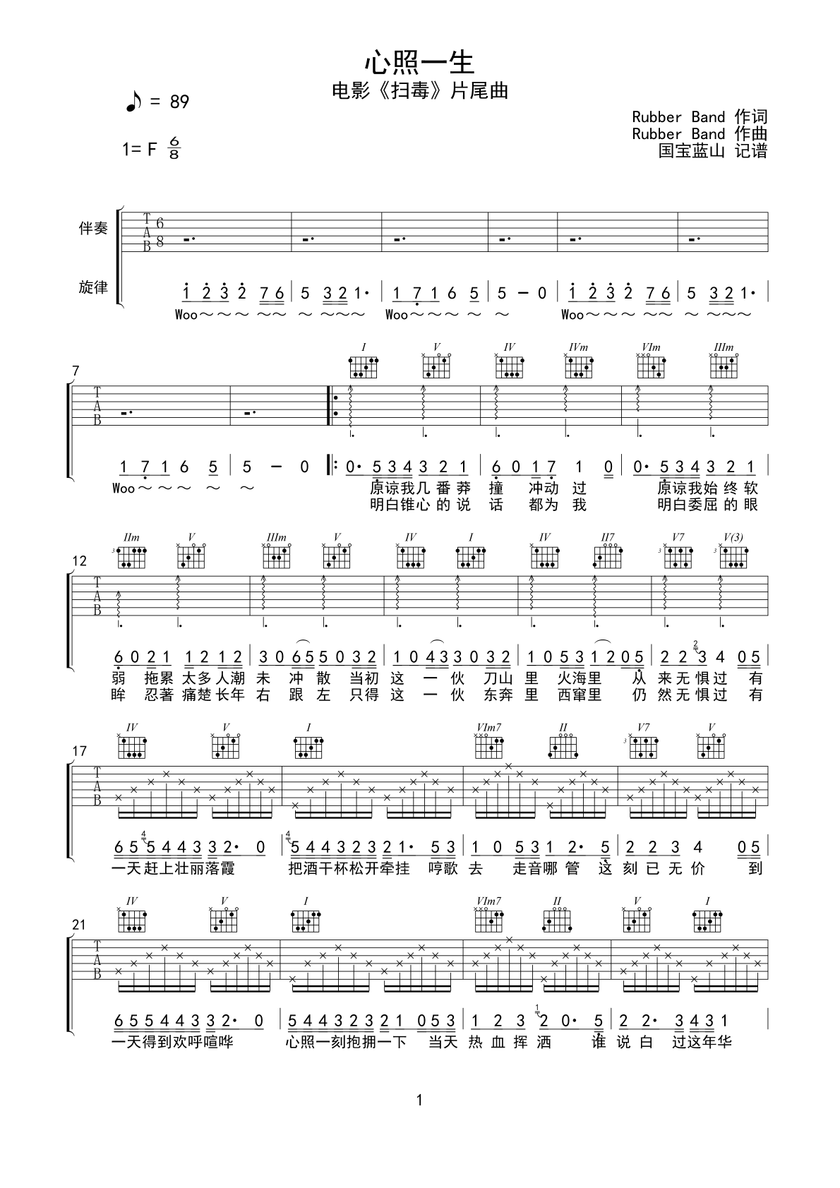 曲谱介绍: RubberBand《心照一生》吉他弹唱谱,采用F调指法编配,国宝蓝山编配出品,共有2张高清图谱,免翻页排版设计。
