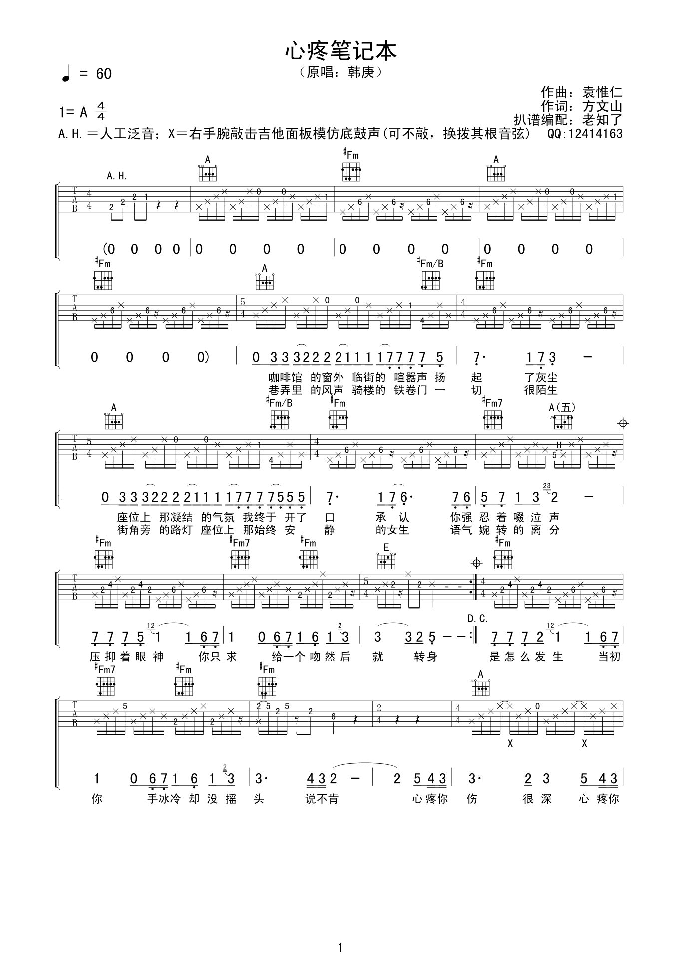 曲谱介绍: 韩庚《心疼笔记本》吉他弹唱谱,采用A调指法编配,老知了编配出品,共有3张高清图谱。