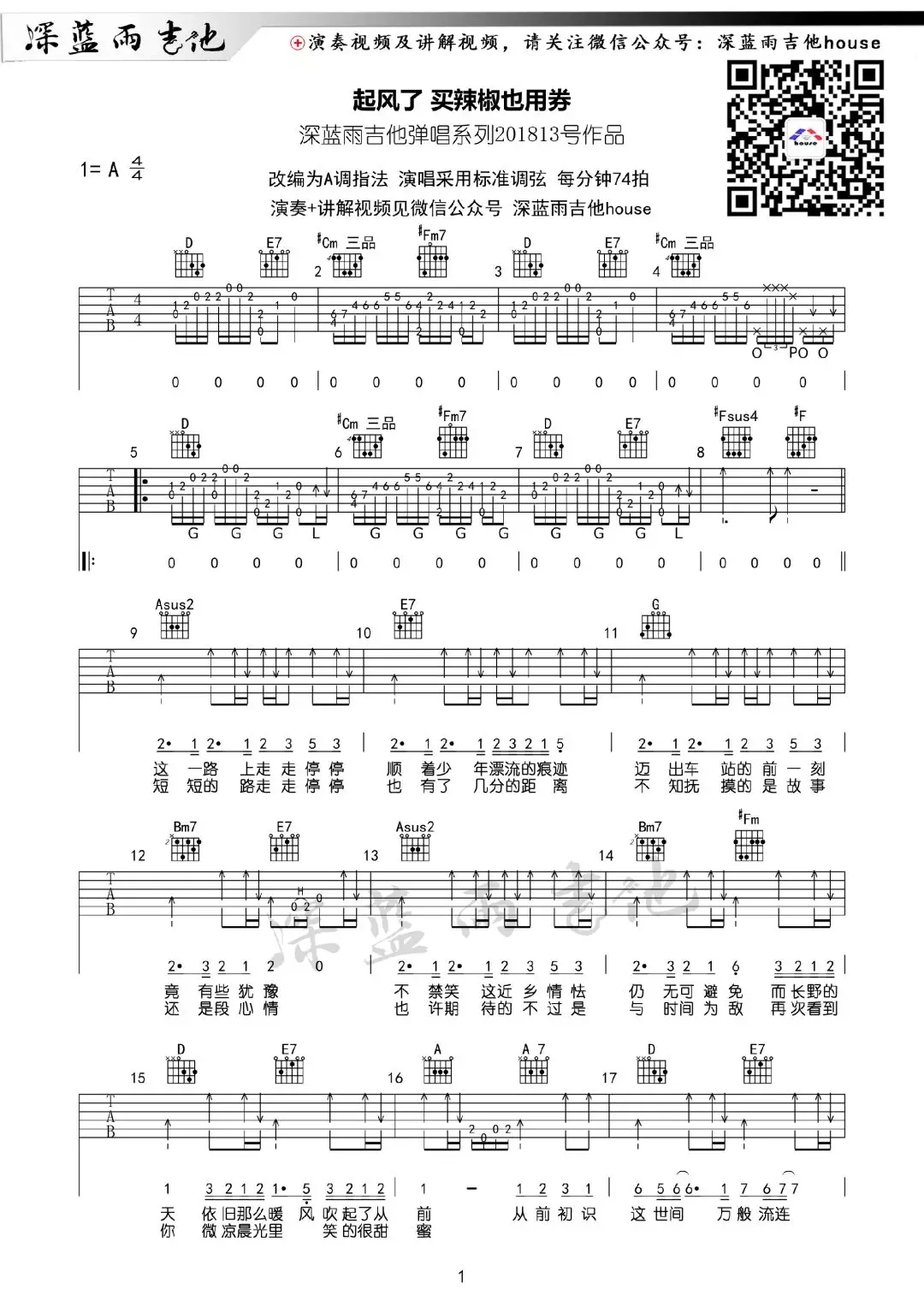 曲谱介绍: 买辣椒也用券《起风了》吉他弹唱谱,采用A调指法编配,深蓝雨吉他编配出品,共有3张高清图谱。