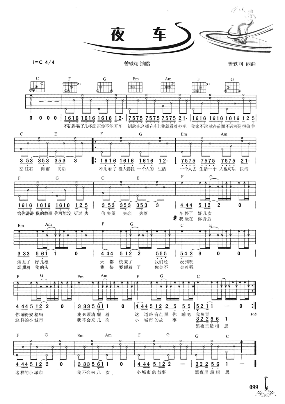 曲谱介绍: 曾轶可《夜车》吉他弹唱谱,采用C调指法编配,共有1张高清图谱,免翻页排版设计。