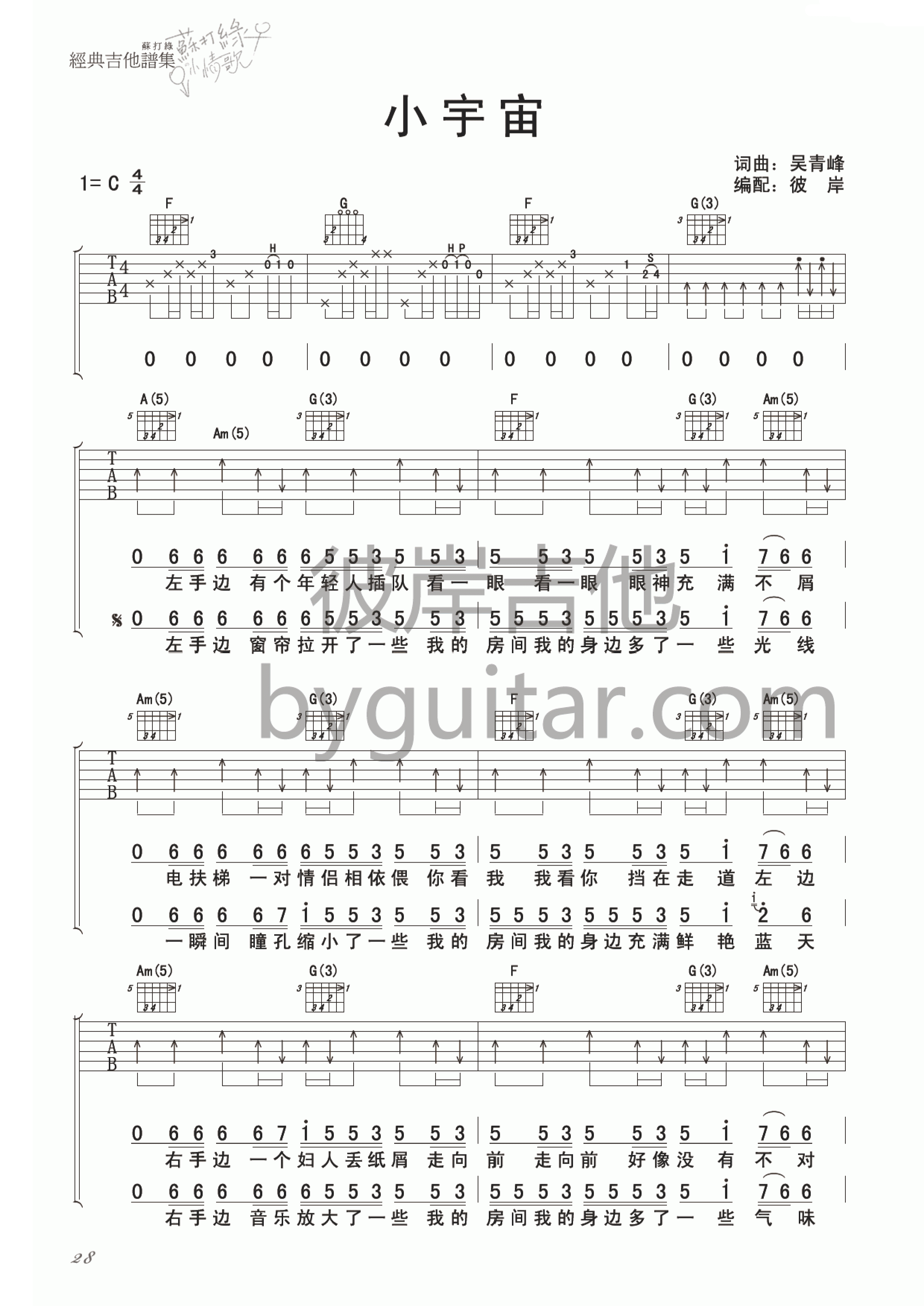 曲谱介绍: 苏打绿《小宇宙》吉他弹唱谱,采用C调指法编配,彼岸吉他编配出品,共有4张高清图谱。