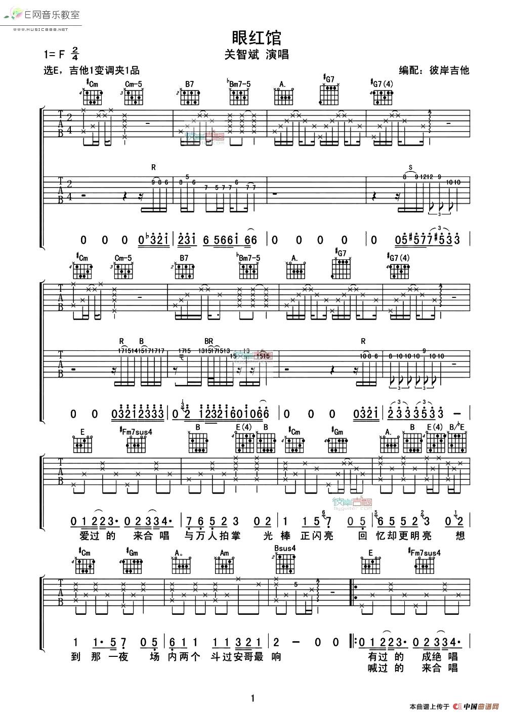 曲谱介绍: 关智斌《眼红馆》吉他弹唱谱,采用F调指法编配,彼岸吉他编配出品,共有3张高清图谱。
