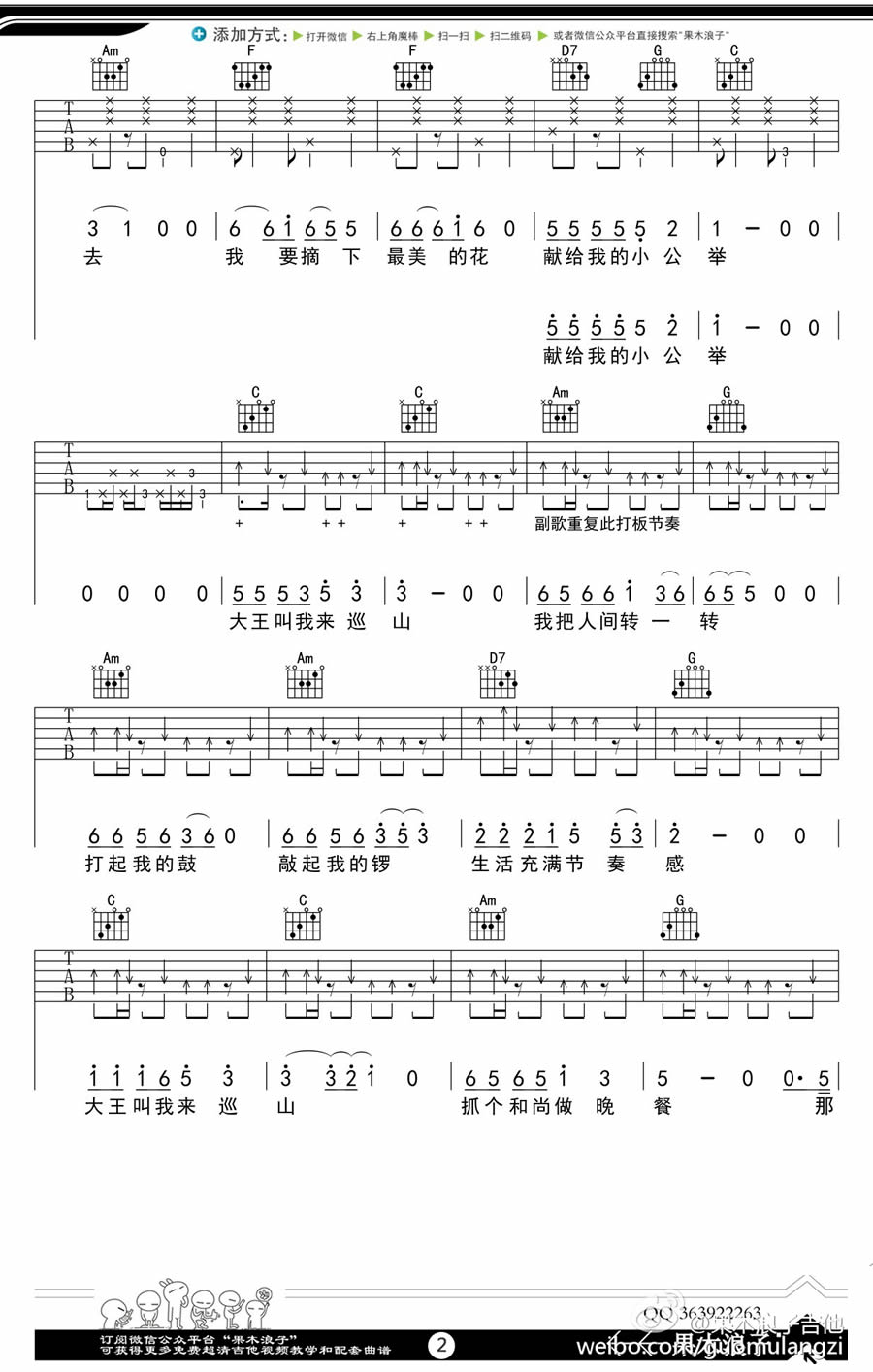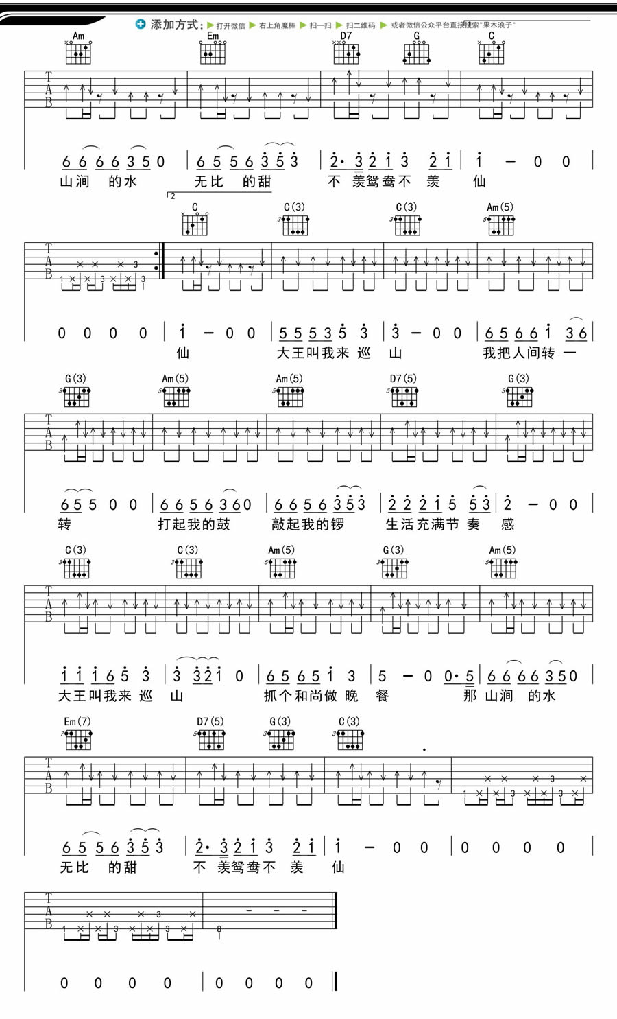 曲谱介绍: 贾乃亮《大王叫我来巡山》吉他弹唱谱,采用C调指法编配,果木浪子编配出品,共有3张高清图谱。