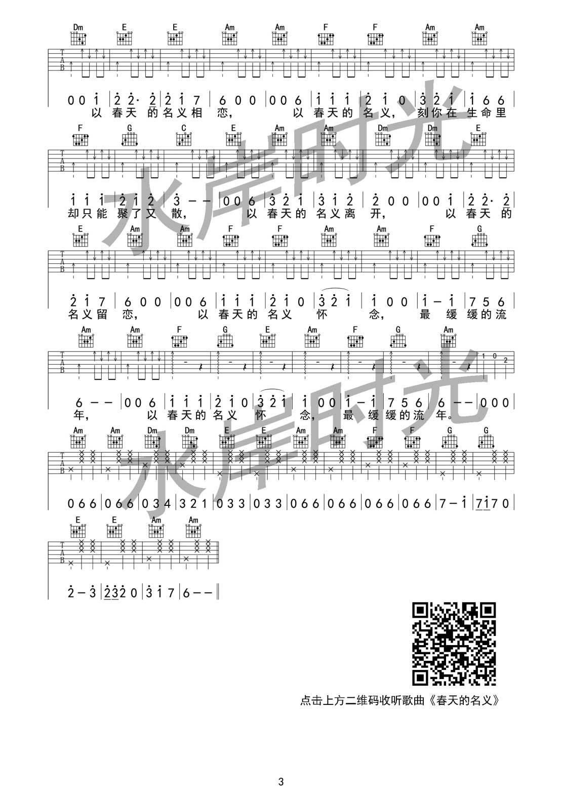 曲谱介绍: 水岸《春天的名义》吉他弹唱谱,采用C调指法编配,水岸时光编配出品,共有3张高清图谱。