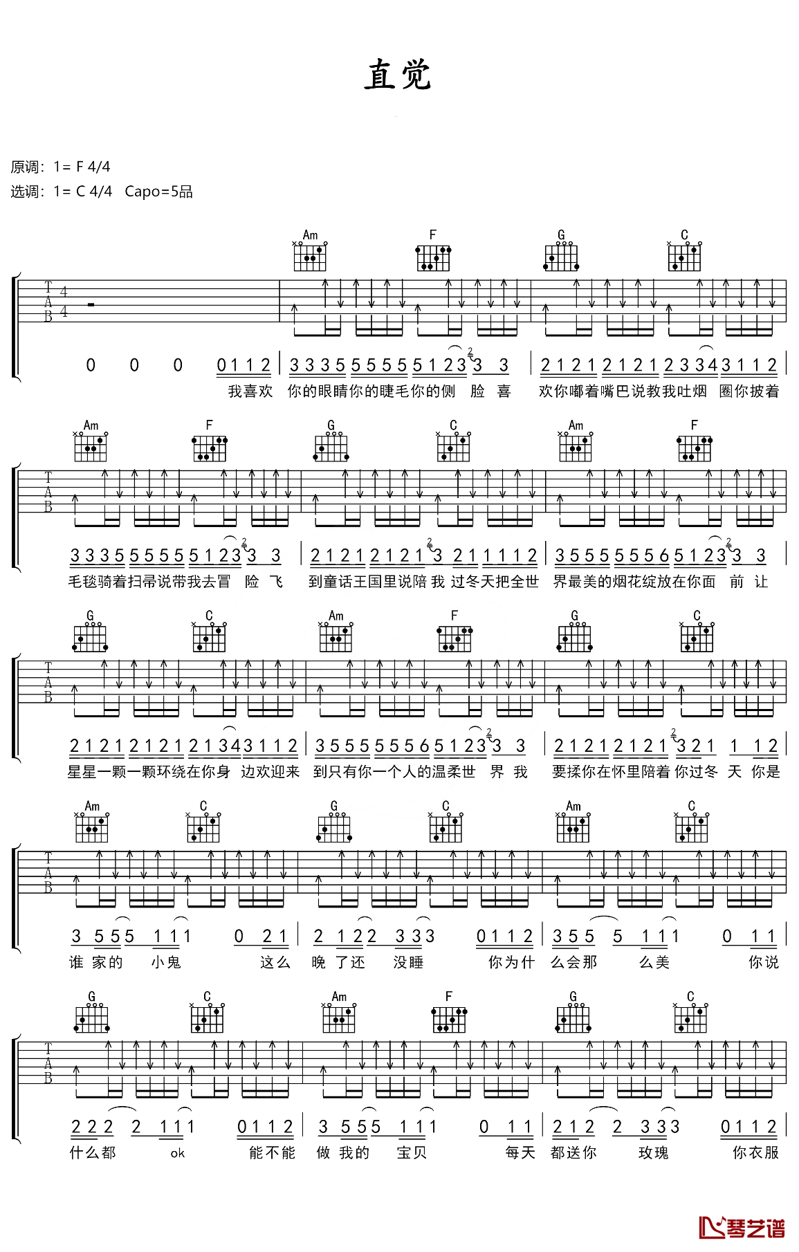 曲谱介绍: 李学仕《直觉》吉他弹唱谱,采用C调指法编配,琴艺谱编配出品,共有2张高清图谱,免翻页排版设计。