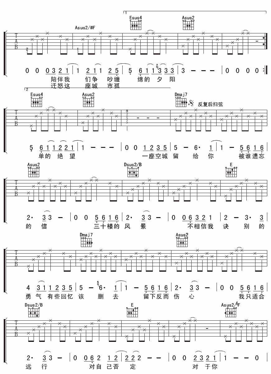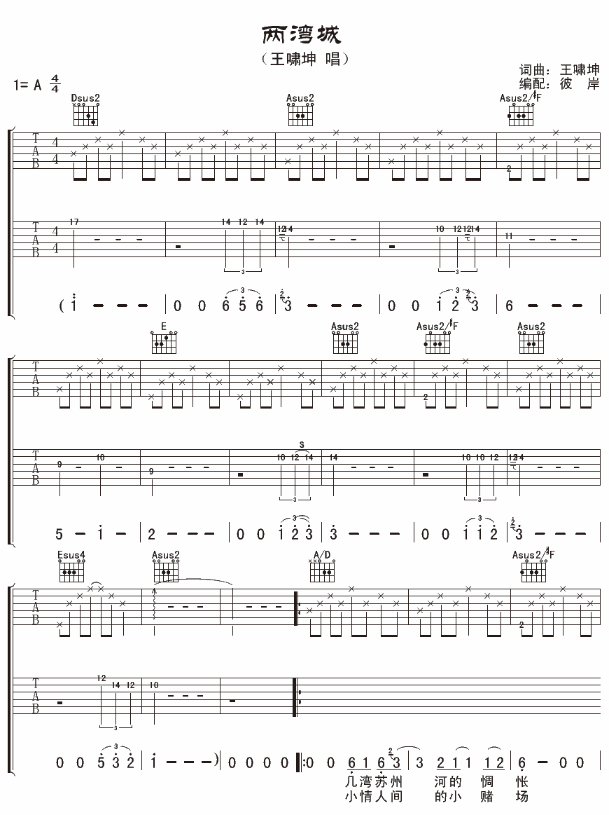 曲谱介绍: 王啸坤《两湾城》吉他弹唱谱,采用A调指法编配,彼岸吉他编配出品,共有3张高清图谱。