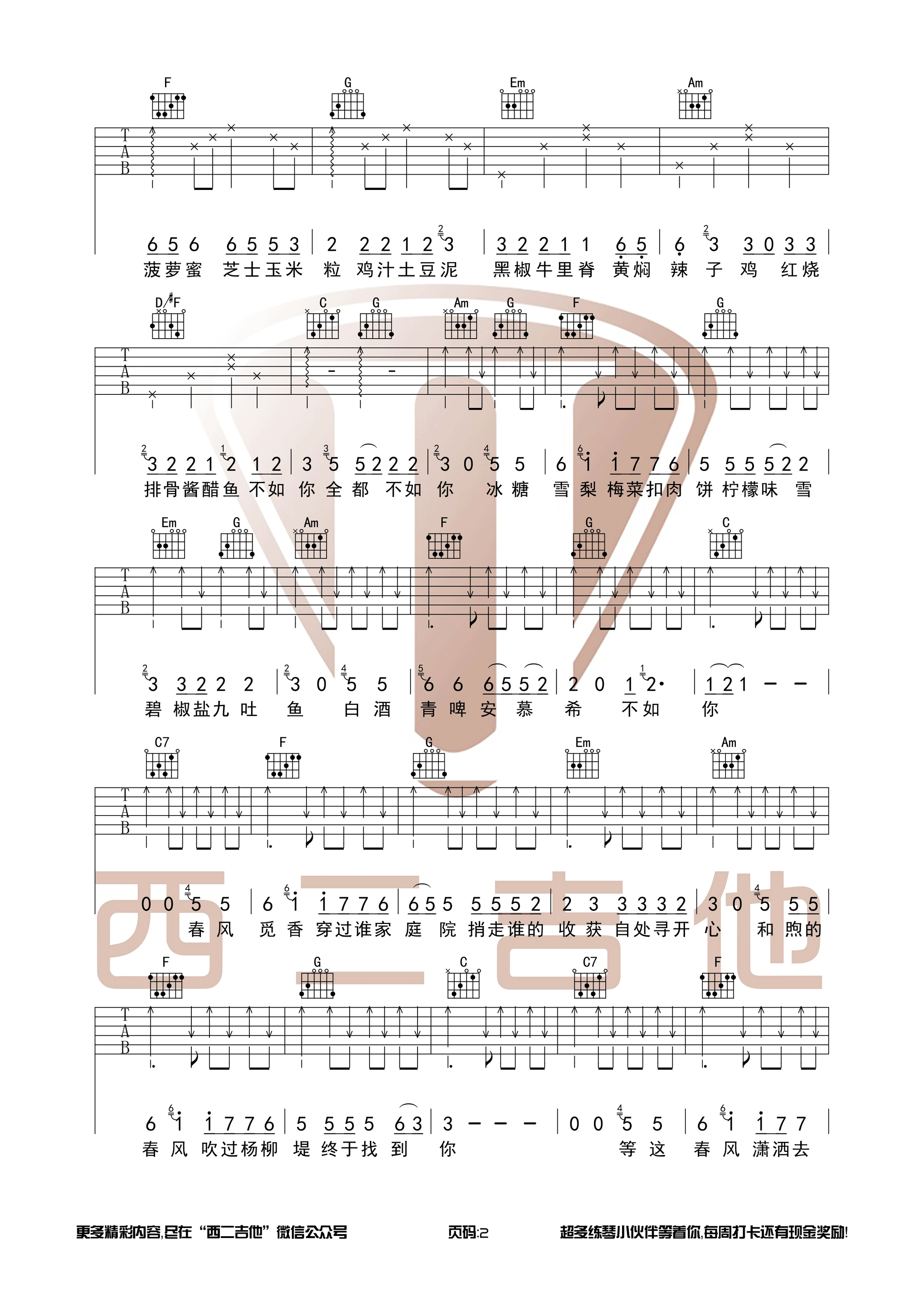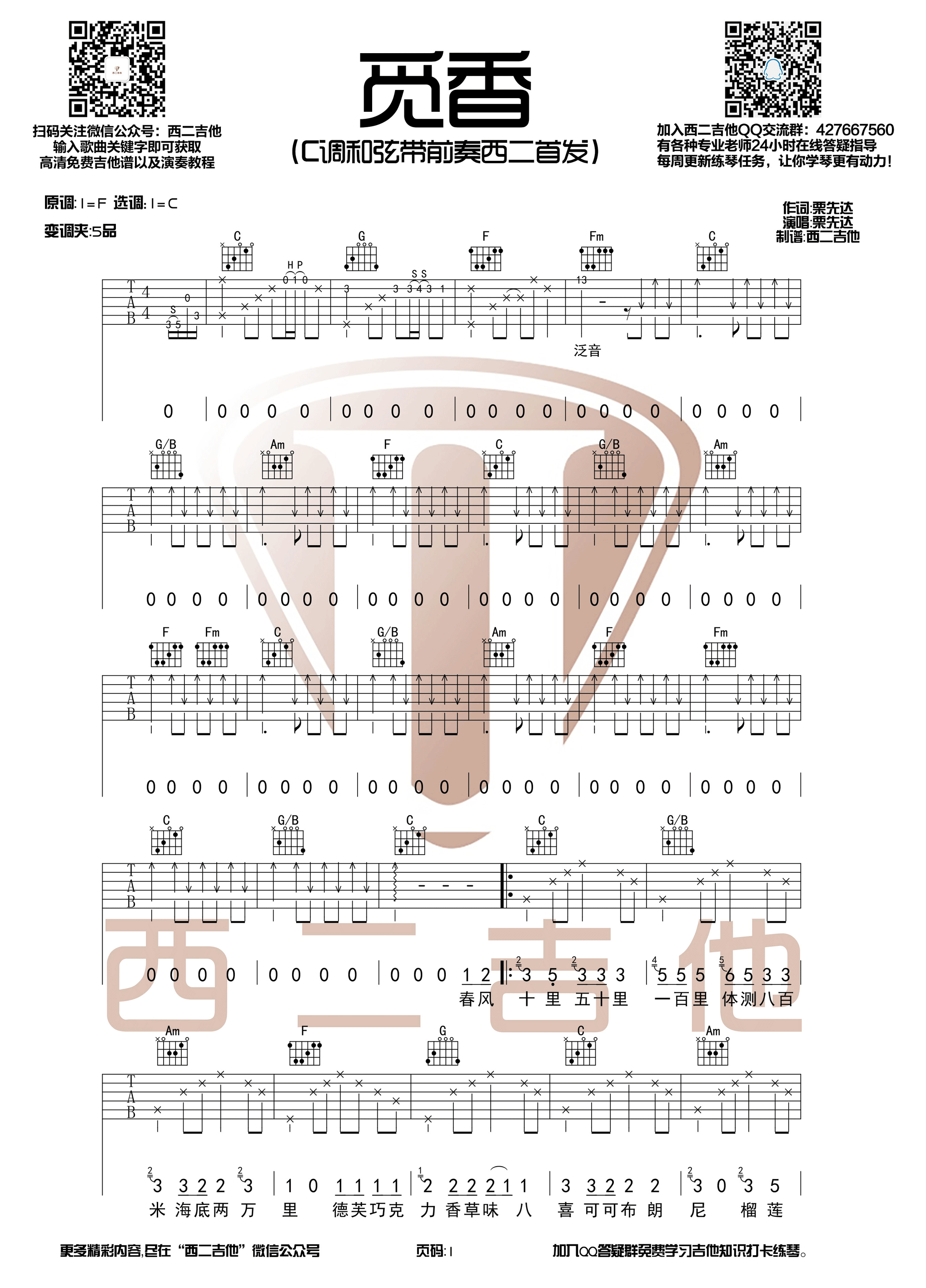 曲谱介绍: 栗先达《觅香》吉他弹唱谱,采用C调指法编配,西二吉他编配出品,共有4张高清图谱。