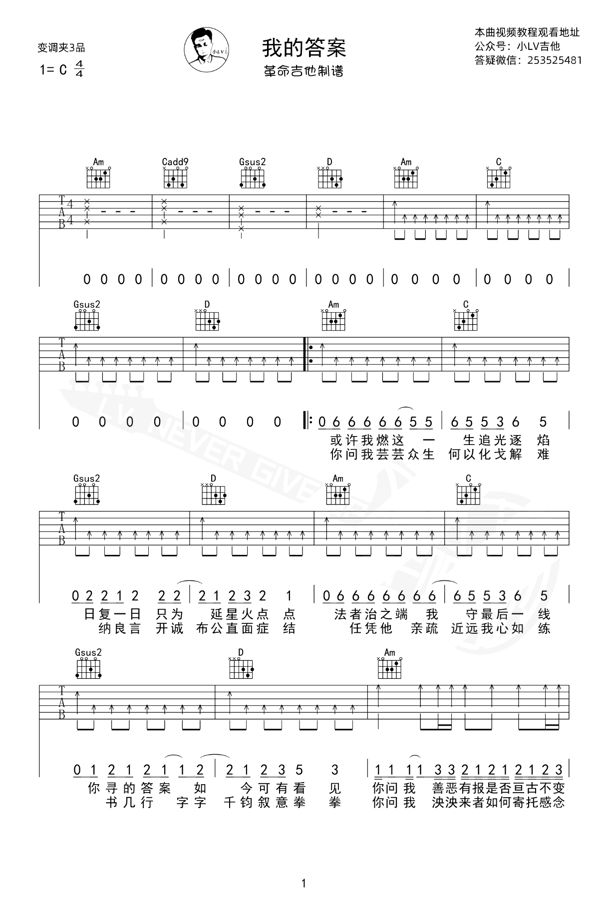曲谱介绍: 《我的答案》吉他弹唱谱+教学视频,C调指法,变调夹夹三品,高清六线谱共三张图片。