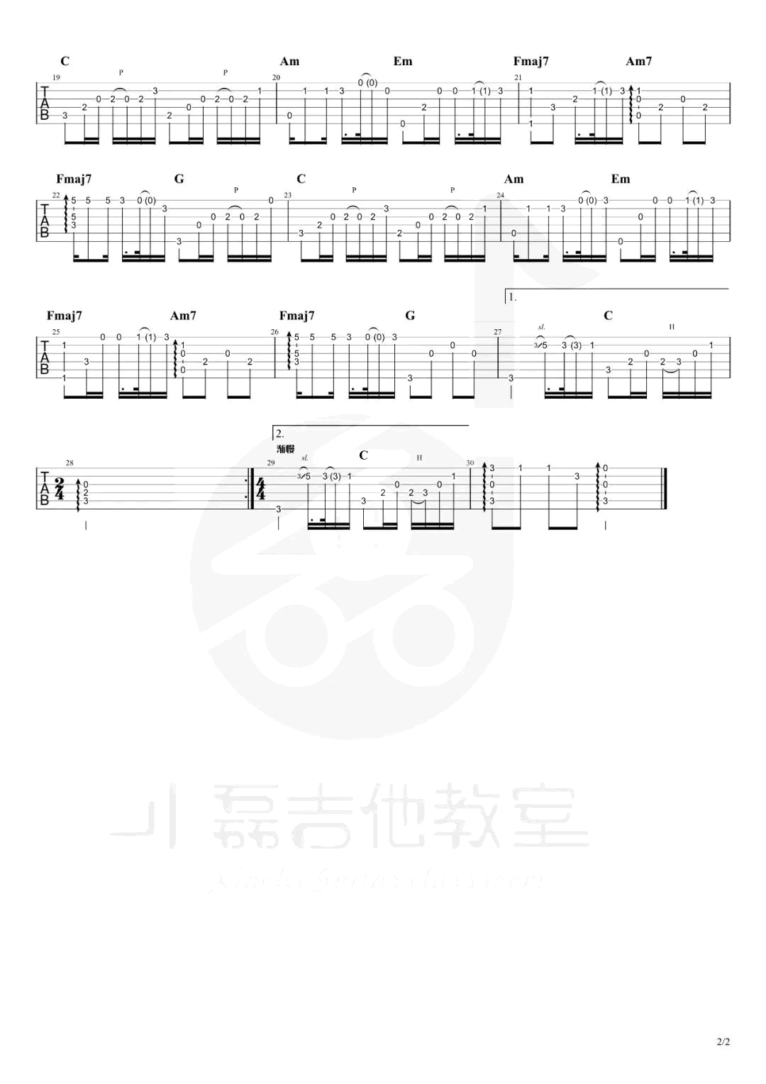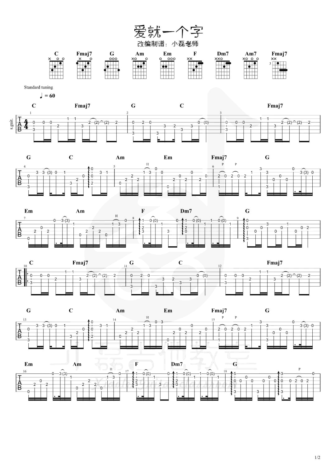 曲谱介绍: 《爱就一个字》吉他独奏视频,吉他独奏谱共两张图片谱例。琴友们跟随小磊老师的演示和教学练习起来。