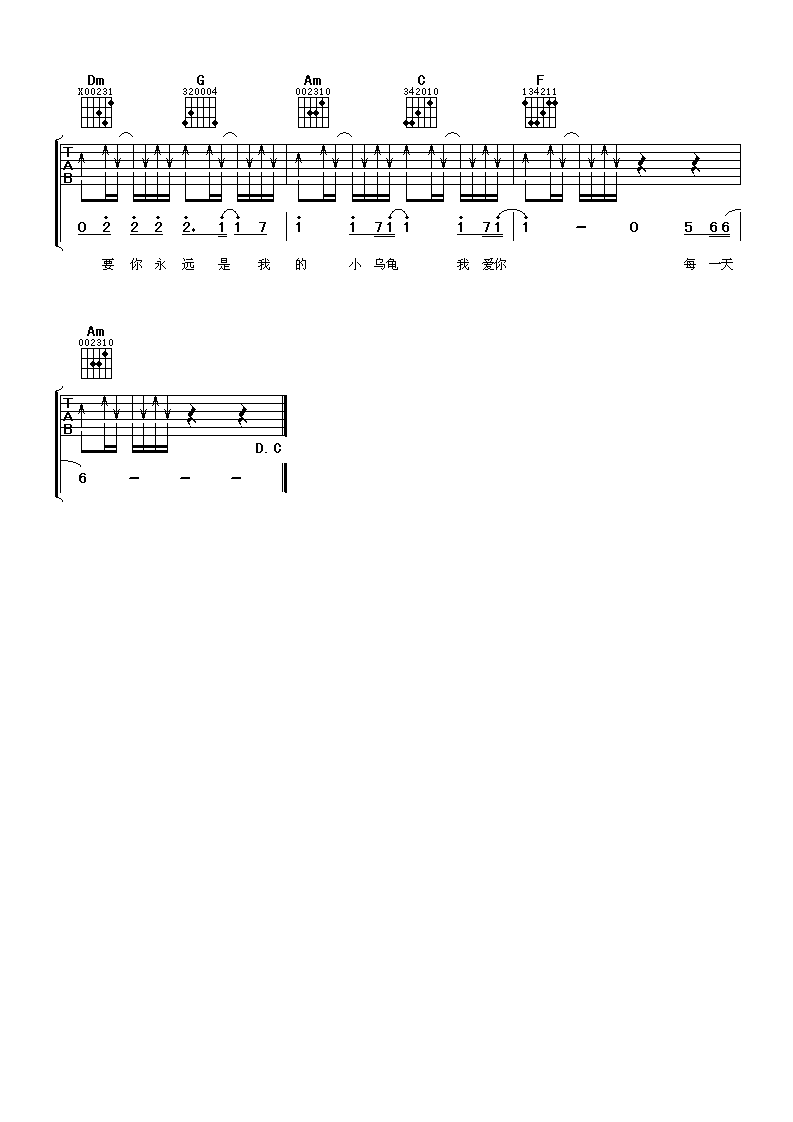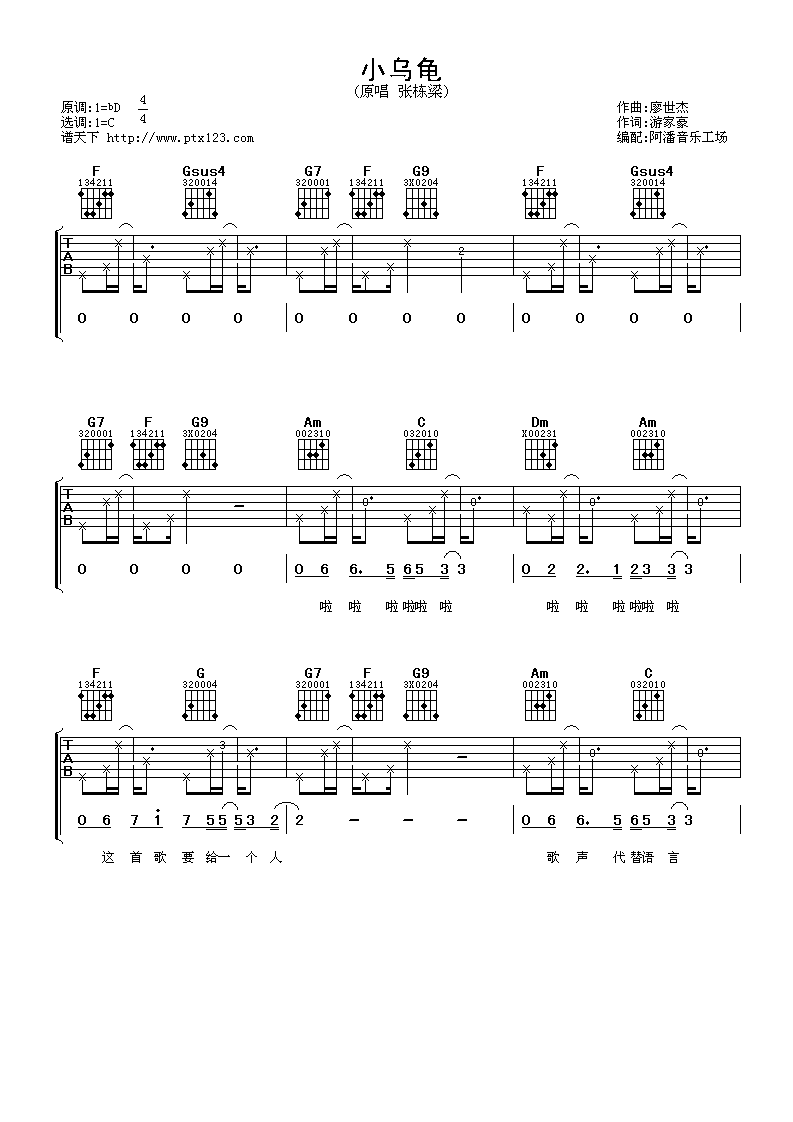 曲谱介绍: 张栋梁《小乌龟》吉他弹唱谱,采用C调指法编配,阿潘音乐工场编配出品,共有3张高清图谱。