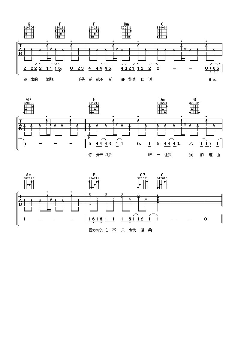 曲谱介绍: 李玖哲《别说》吉他弹唱谱,采用F调指法编配,阿潘音乐工场编配出品,共有3张高清图谱。
