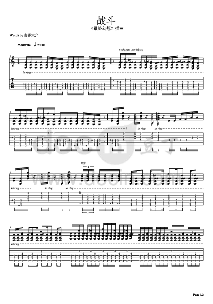 曲谱介绍: 南泽大介《战斗》吉他独奏谱,豆丁网编配出品,共有2张高清图谱,免翻页排版设计。