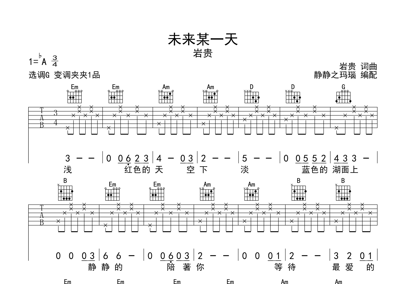 曲谱介绍: 《未来某一天》吉他谱,岩贵演唱,共三张高清图片谱,《未来某一天》吉他弹唱谱,本谱采用G调和弦指法编配,节奏为4/4拍,速度为75拍每分钟,弹唱建议变调夹夹1品,也可以根据个人嗓音找到一个舒服的位置,难度初级,本谱由静静之玛瑙制谱。