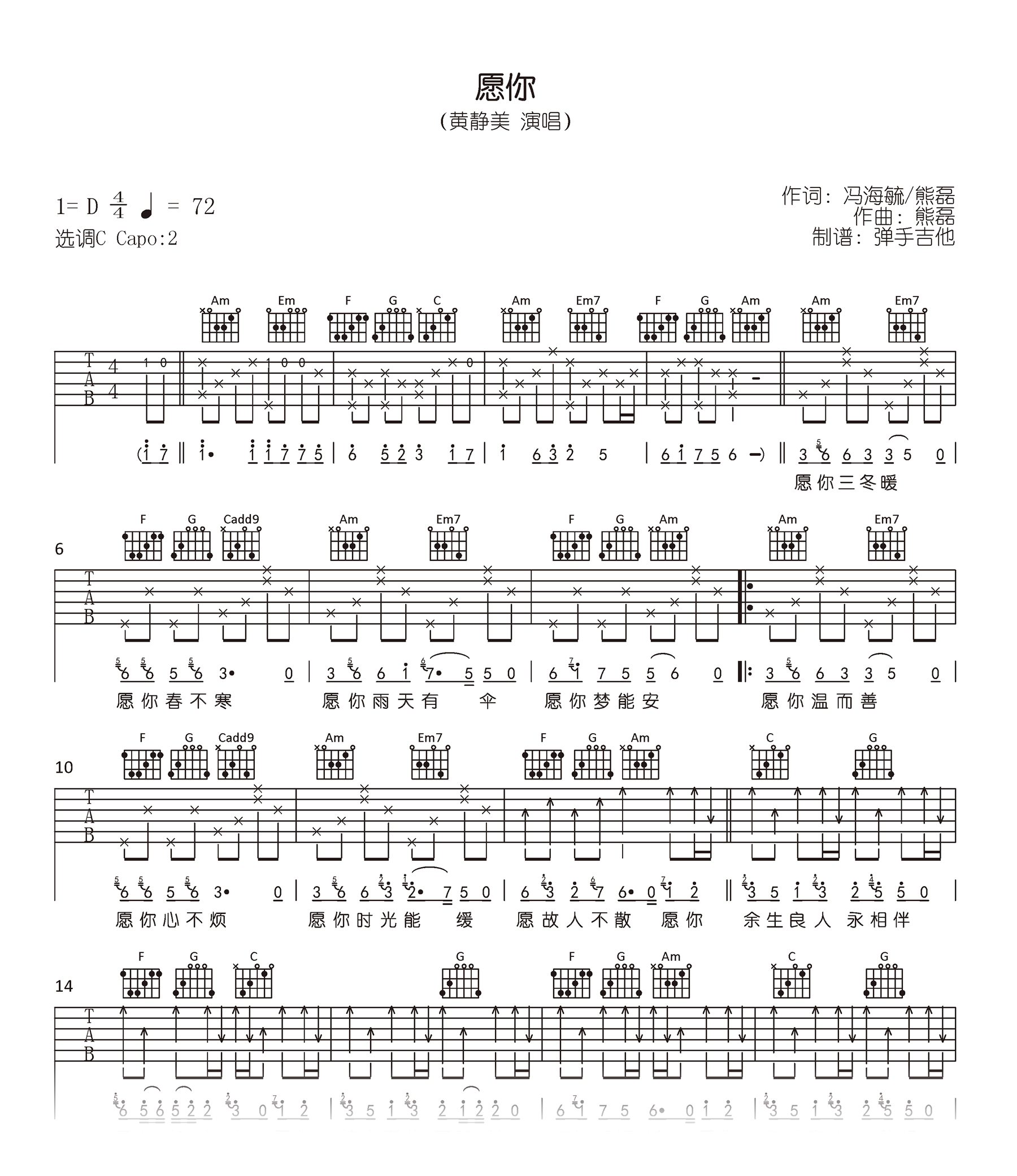 曲谱介绍: 《愿你》吉他弹唱谱,原调D选调C,CAPO夹二品,两张高清图片六线谱。
