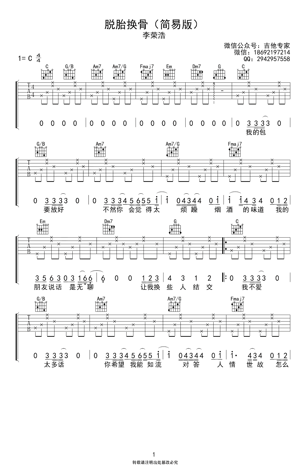 曲谱介绍: 李荣浩《脱胎换骨》吉他弹唱谱,C调简易版编配,三张图片六线谱。
