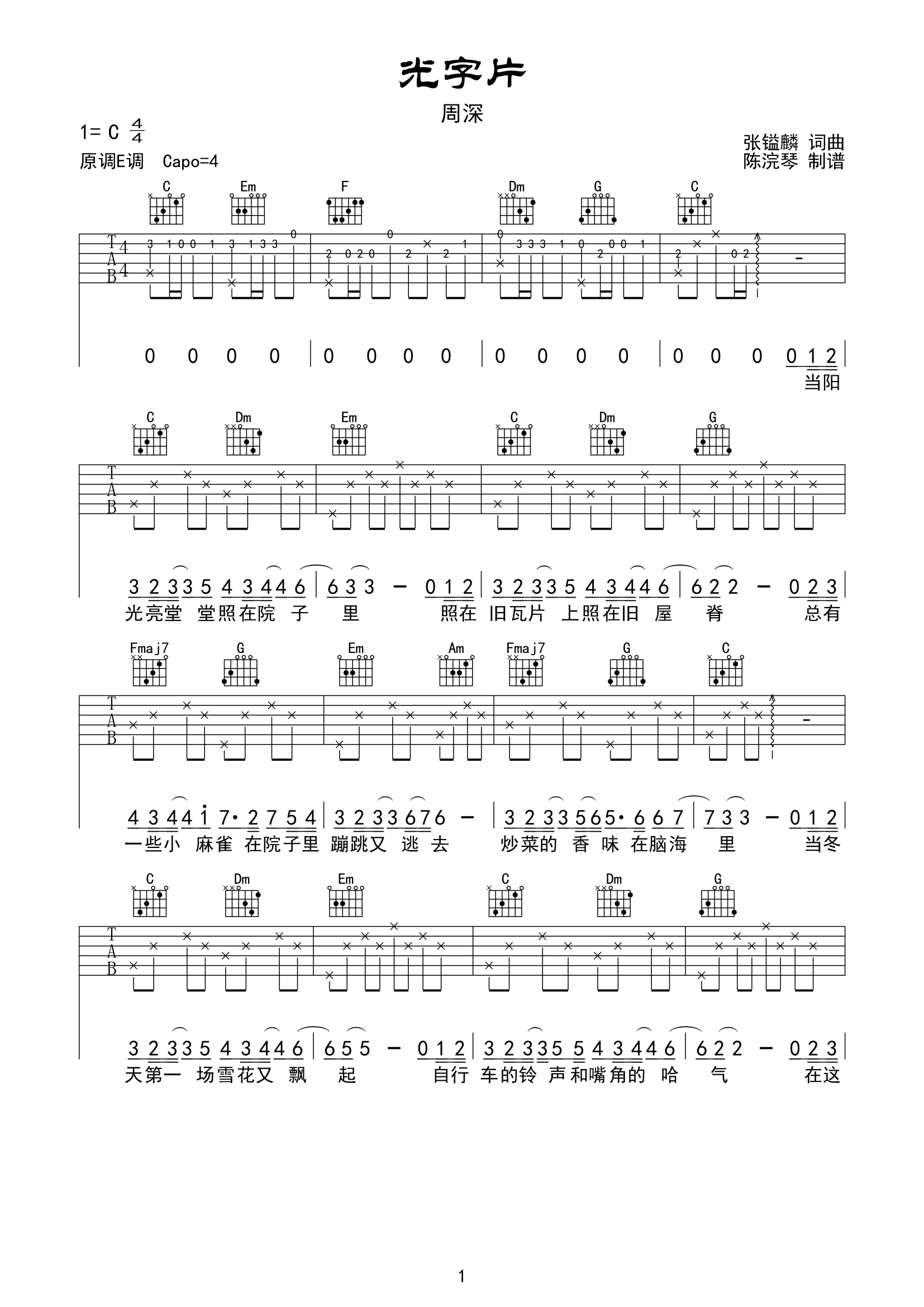 曲谱介绍: 光字片吉他谱,周深演唱的《人世间》主题曲,温情而细腻,治愈着人世间的情感,《光字片》吉他六线谱,共三张高清图片谱例,本谱为C调编配吉他谱,变调夹夹4品弹唱原调E调,共三张高清图片谱,节奏4/4拍,包含完整前奏,难度初级简单。
