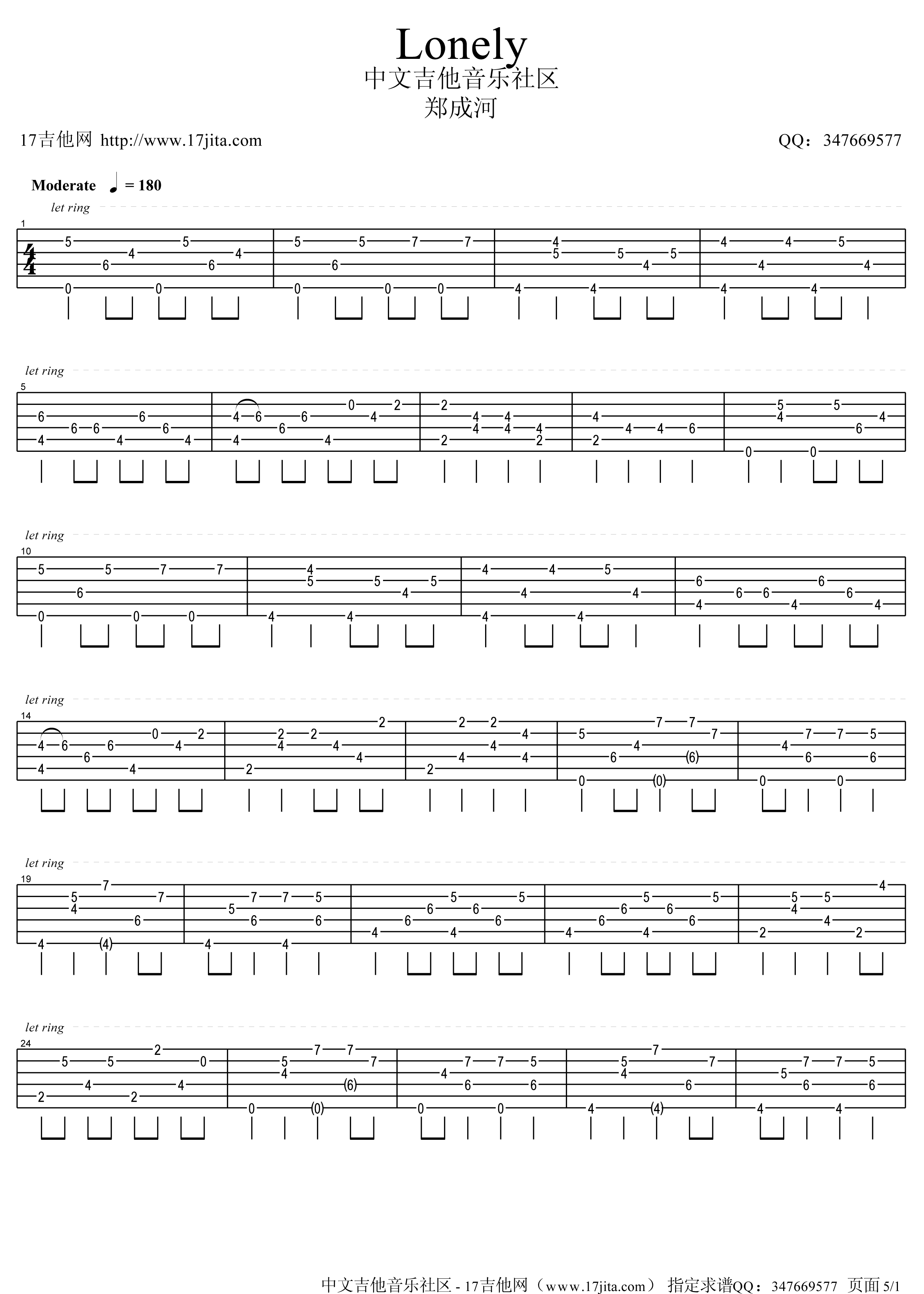 曲谱介绍: 郑成河《lonely》吉他独奏谱,采用C调指法编配,17吉他编配出品,共有5张高清图谱。