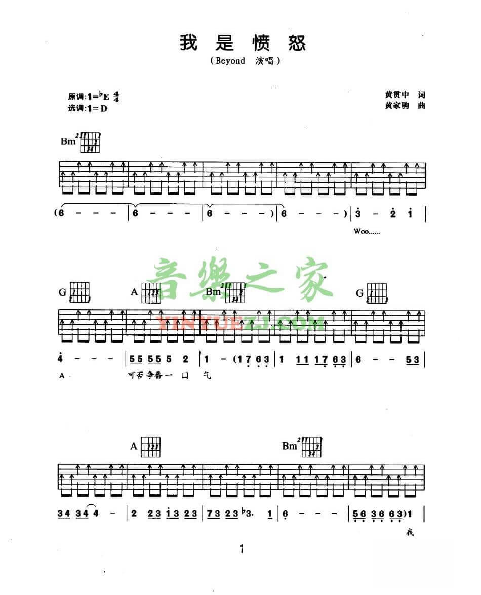 曲谱介绍: Beyond《我是愤怒扫弦》吉他弹唱谱,采用D调指法编配,音乐之家编配出品,共有5张高清图谱。