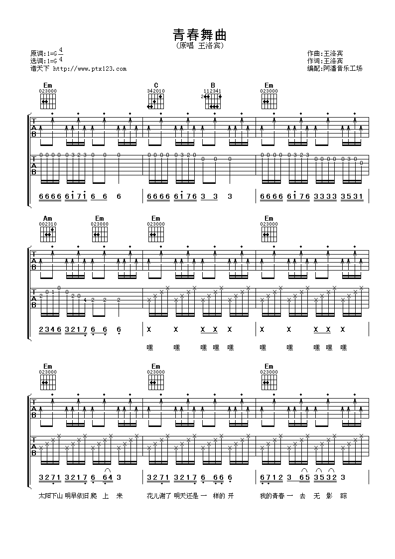 曲谱介绍: 王洛宾《青春舞曲》吉他弹唱谱,采用G调指法编配,阿潘音乐工场编配出品,共有2张高清图谱,免翻页排版设计。