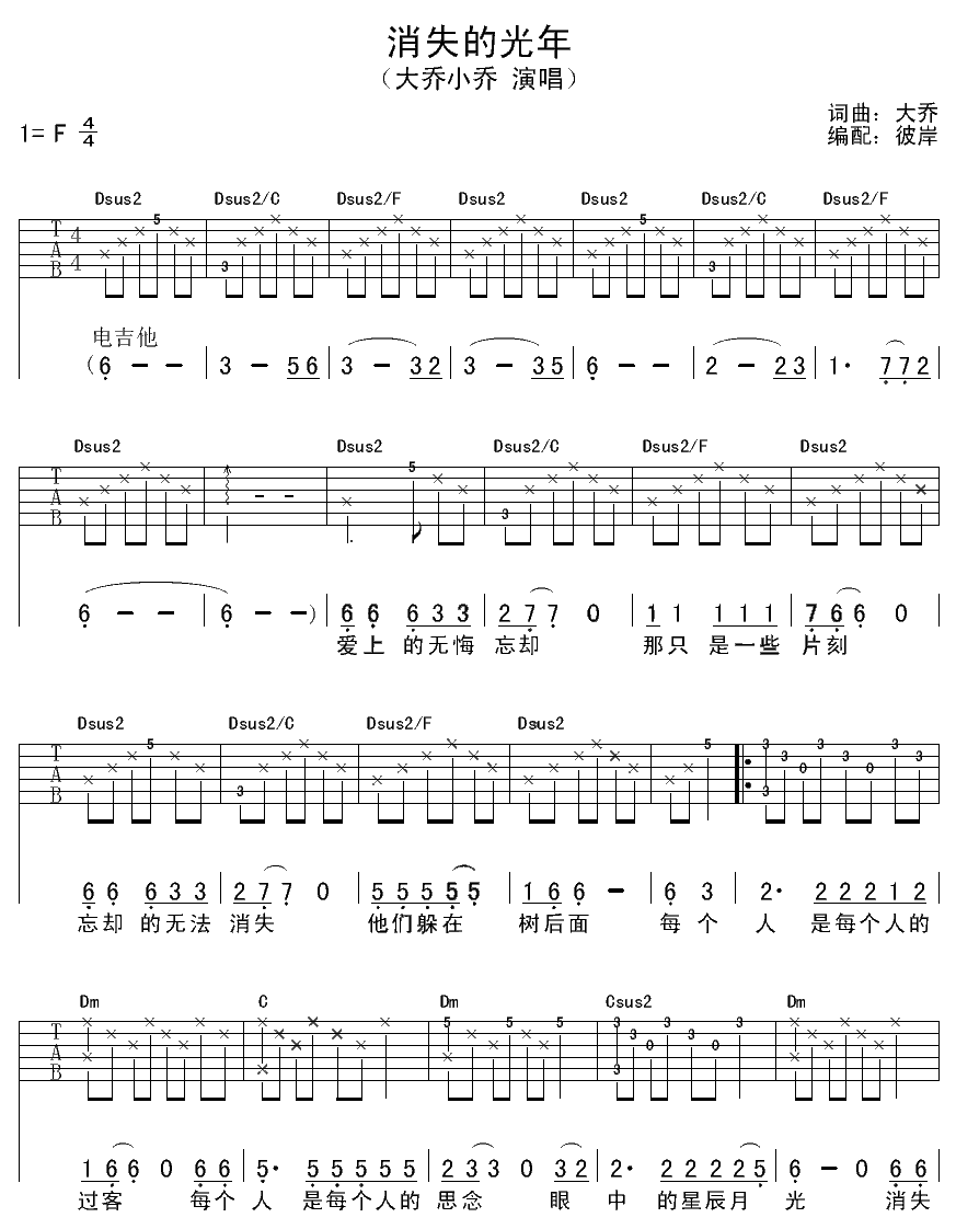 曲谱介绍: 大乔小乔《消失的光年》吉他弹唱谱,采用F调指法编配,彼岸吉他编配出品,共有2张高清图谱,免翻页排版设计。