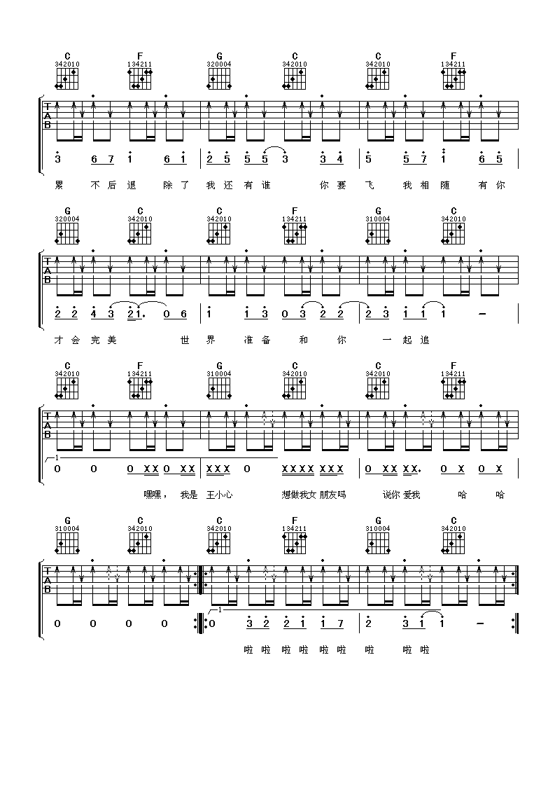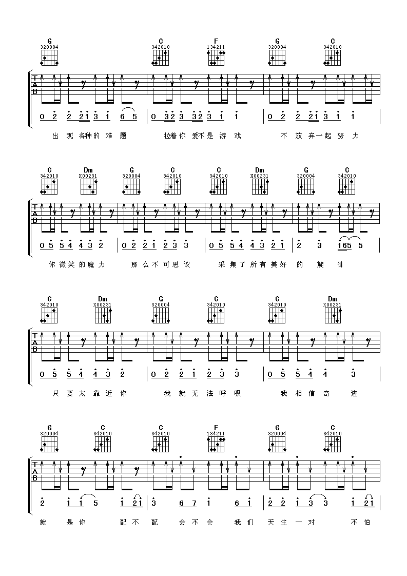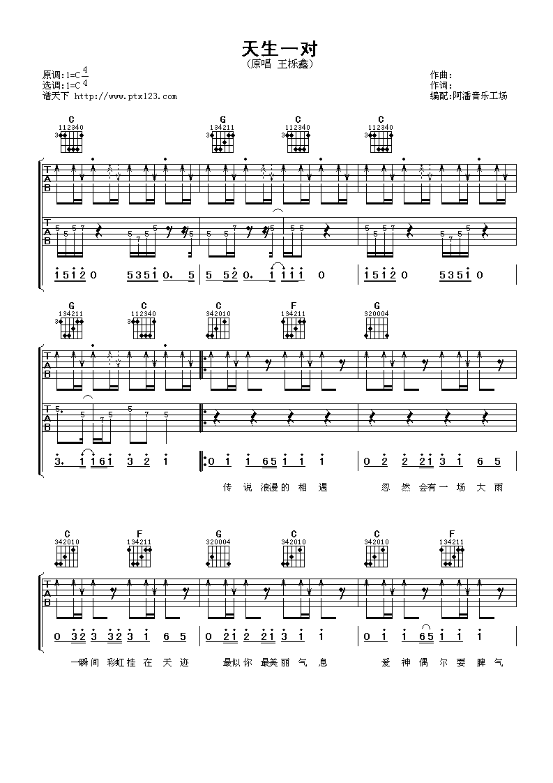 曲谱介绍: 王栎鑫《天生一对》吉他弹唱谱,采用C调指法编配,阿潘音乐工场编配出品,共有3张高清图谱。