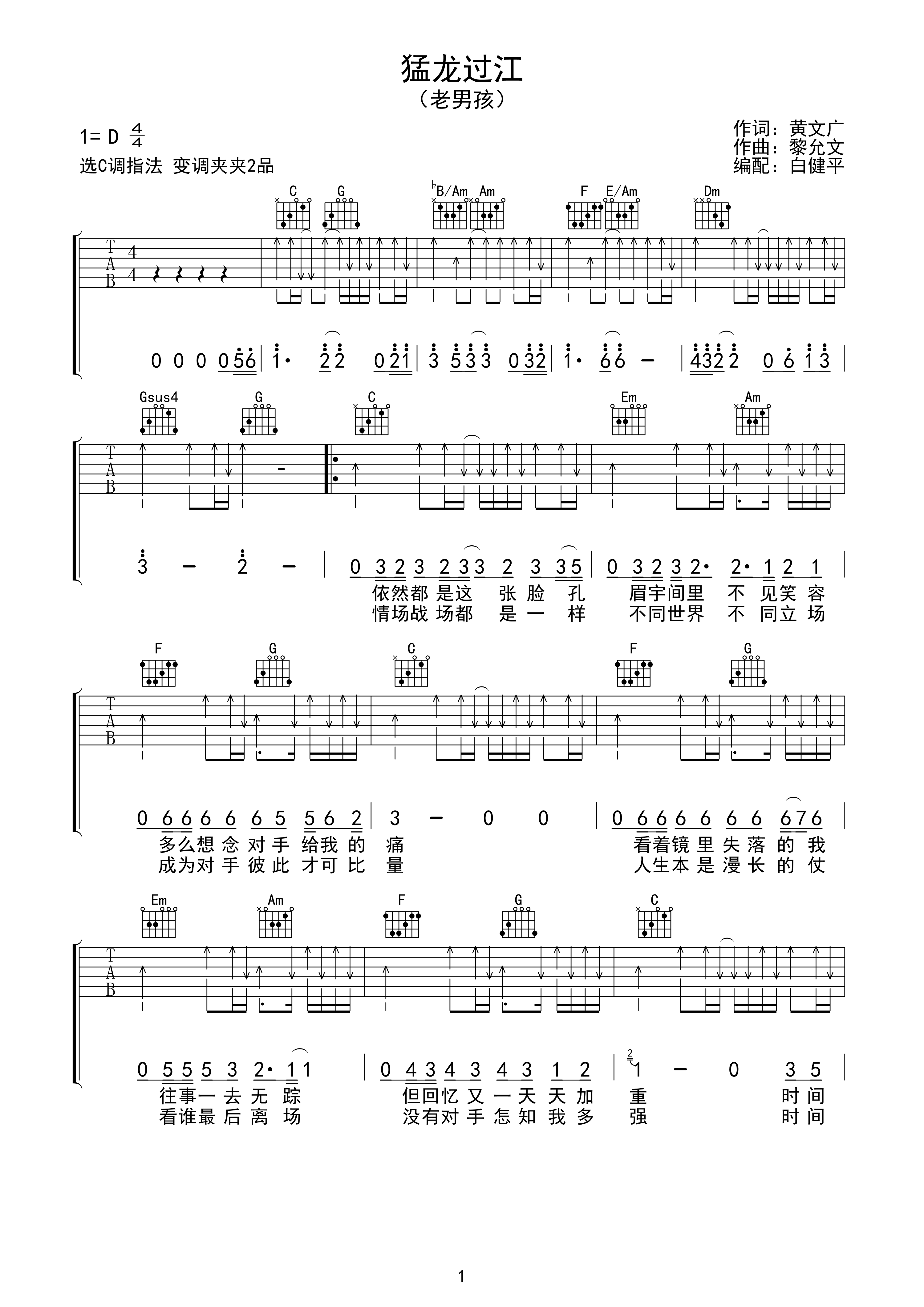 曲谱介绍: 筷子兄弟《猛龙过江》吉他弹唱谱,采用C调指法编配,白健平编配出品,共有3张高清图谱。