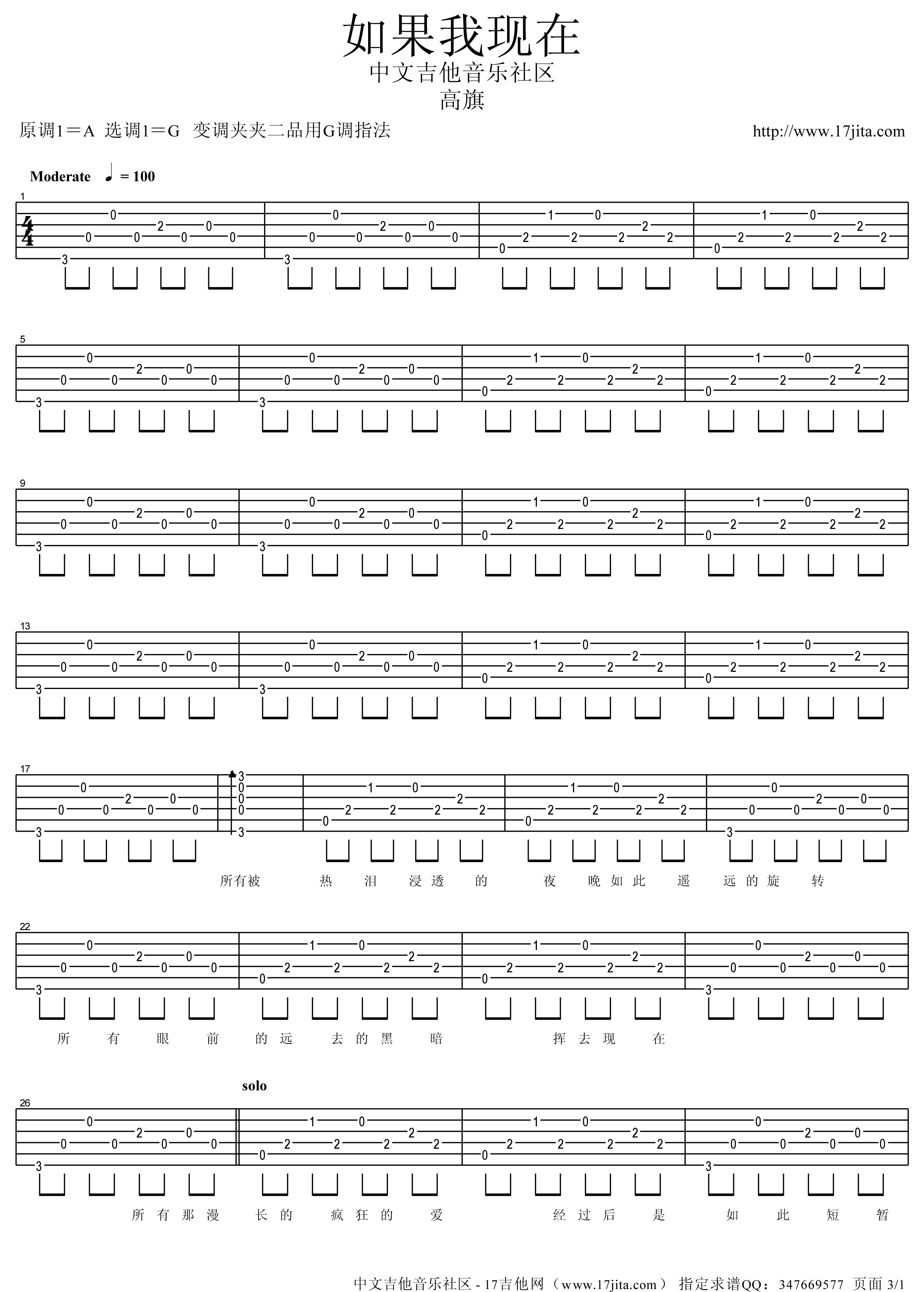 曲谱介绍: 超载乐队《如果我现在》吉他独奏谱,采用A调指法编配,17吉他编配出品,共有3张高清图谱。