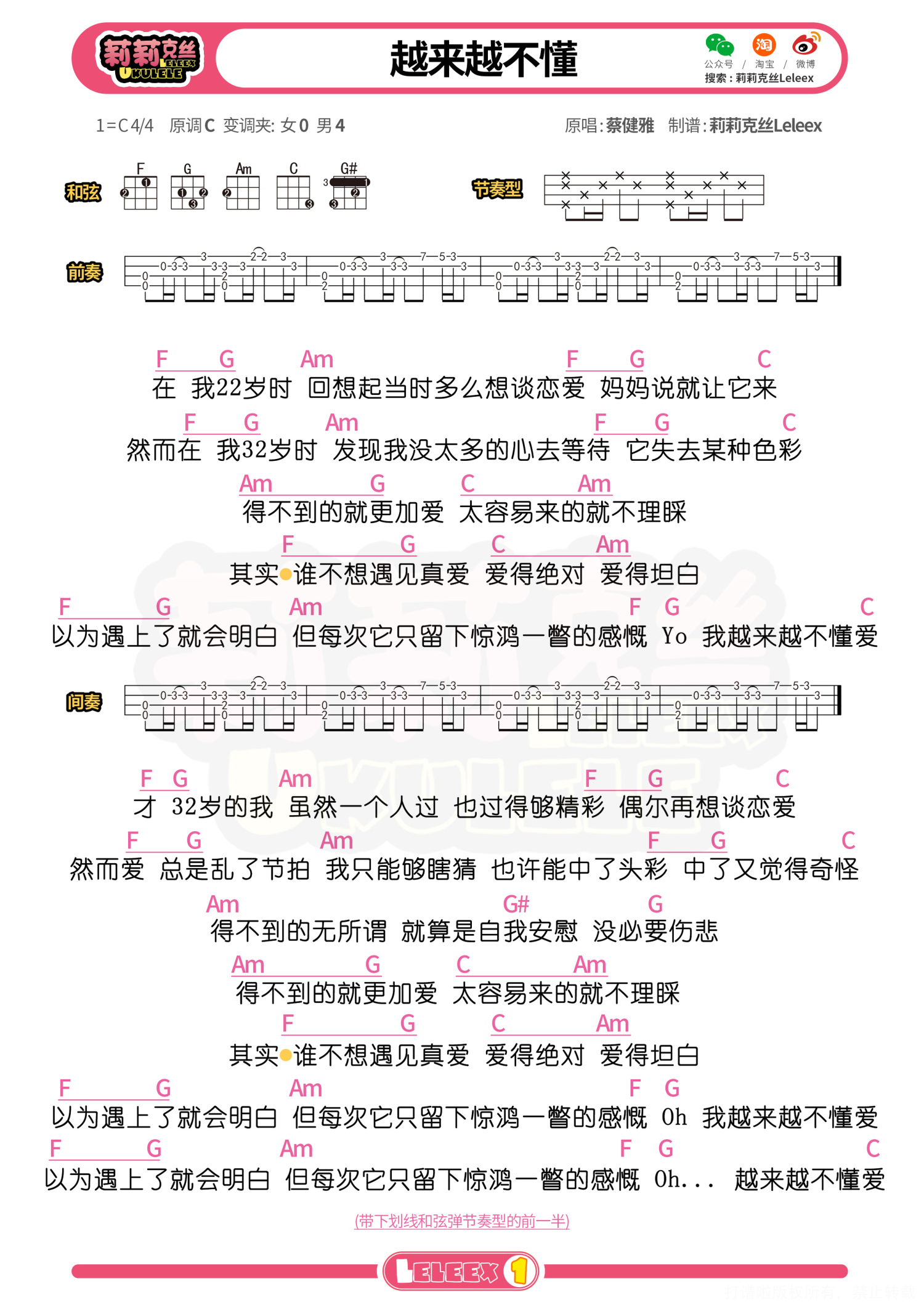 曲谱介绍: 「越来越不懂」尤克里里谱 更多尤克里里曲谱/教学  关注@莉莉克丝Leleex