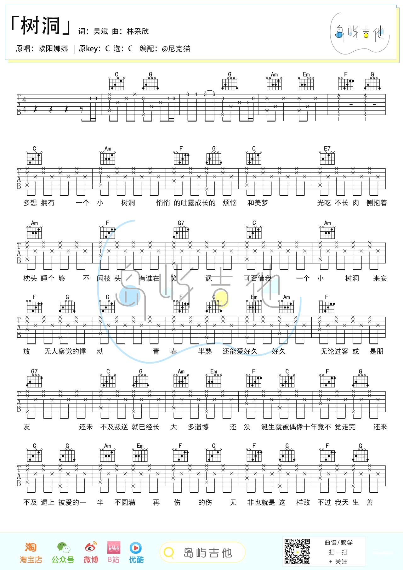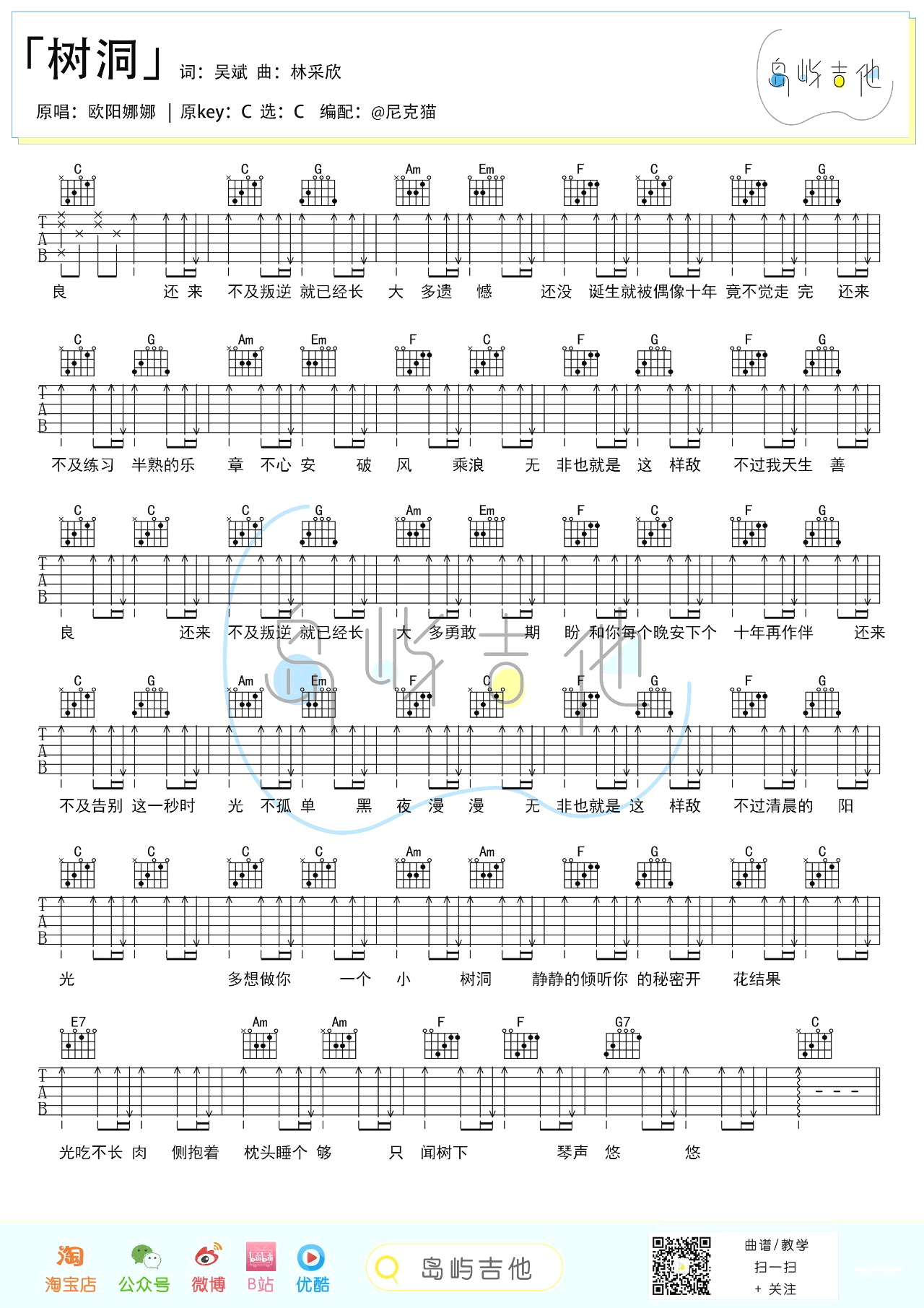 曲谱介绍: 欧阳娜娜《树洞》吉他弹唱谱,采用C调指法编配,岛屿吉他编配出品,共有3张高清图谱。