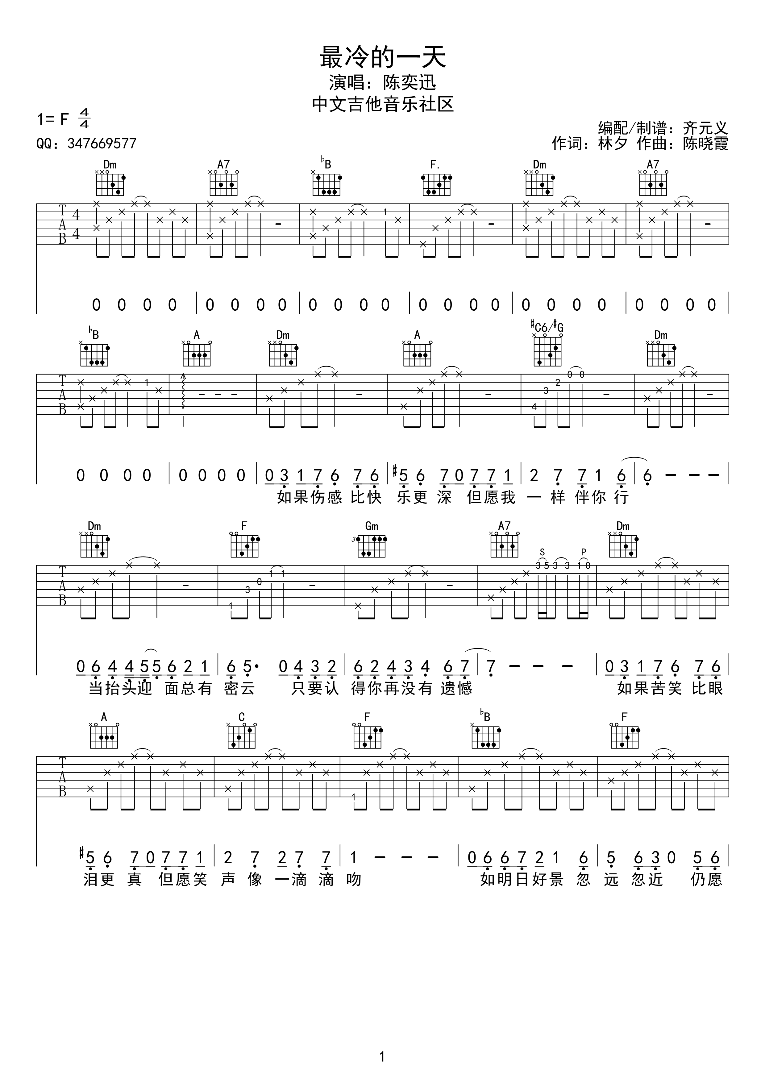 曲谱介绍: 陈奕迅《最冷一天》吉他弹唱谱,采用F调指法编配,17吉他编配出品,共有4张高清图谱。