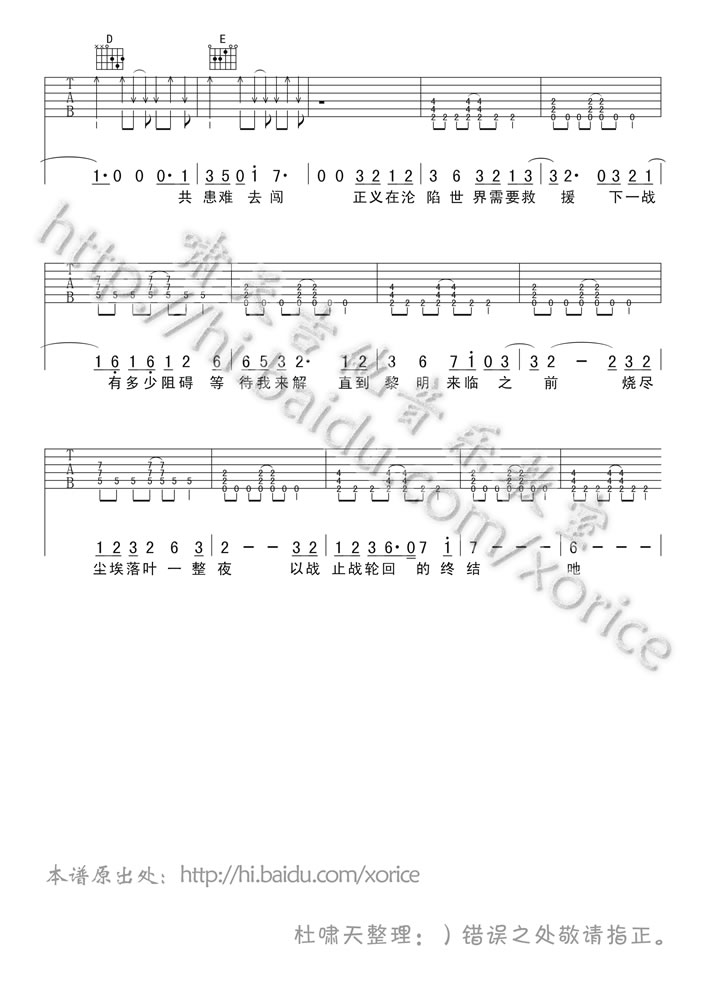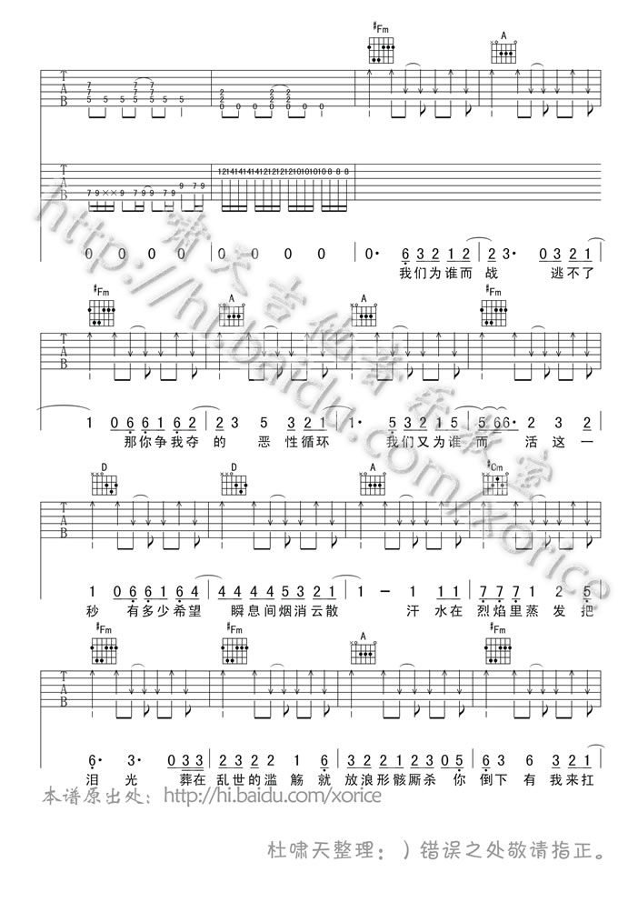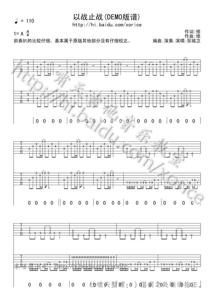 曲谱介绍: 东城卫《以战止战》吉他弹唱谱,采用A调指法编配,啸天吉他音乐教室编配出品,共有3张高清图谱。